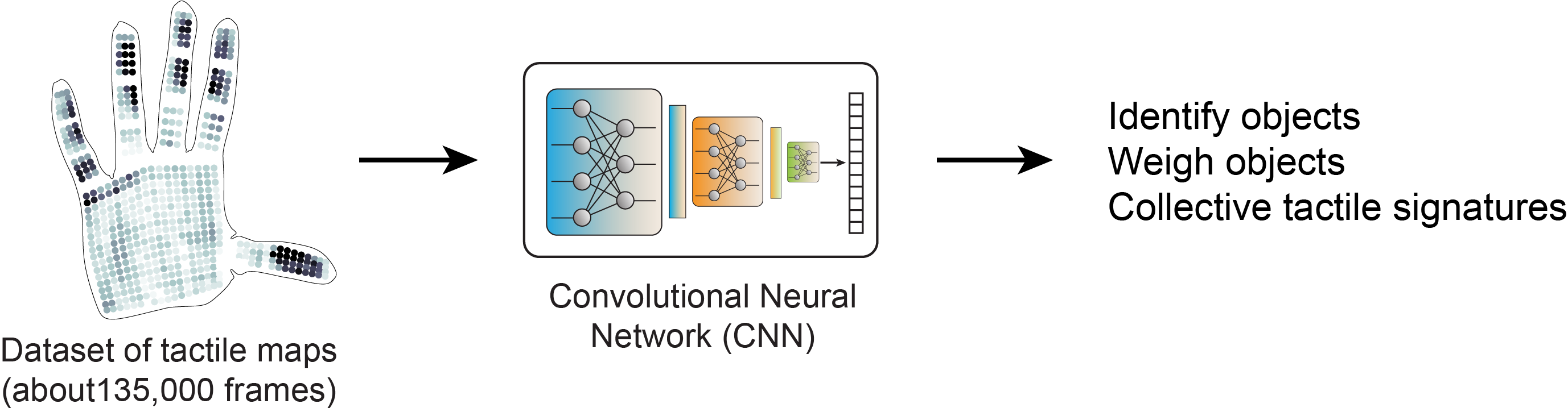 With this backdrop, we report a scalable tactile glove constructed using readily available materials and simple fabrication tools in a paper appearing in Nature. The glove consists of a sensing sleeve with 548 sensors that are uniformly distributed on the hand and respond to normal forces (see figure). Additionally, this sensor architecture can be readily translated to cover different surfaces, without size restrictions originating from the used fabrication methods. Using this tactile glove, we recorded a large-scale dataset of tactile maps (about 135,000 frames) each covering the hand while interacting with 26 different objects. We observed that using convolutional neural networks (CNNs) it was possible to identify objects or estimate their weights from the tactile information recorded during these interactions. The trained CNNs learned to look for simple geometric features like edges or pointed forces and were also activated by simplistic features of the grasp such as the use of a thumb. Finally, we were also able to look at the collaborative role of different regions of the hand when interacting with objects. This is generally known but it is now possible to quantify this purely from the collective set of object interactions.