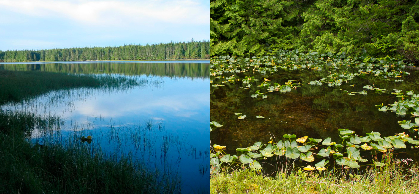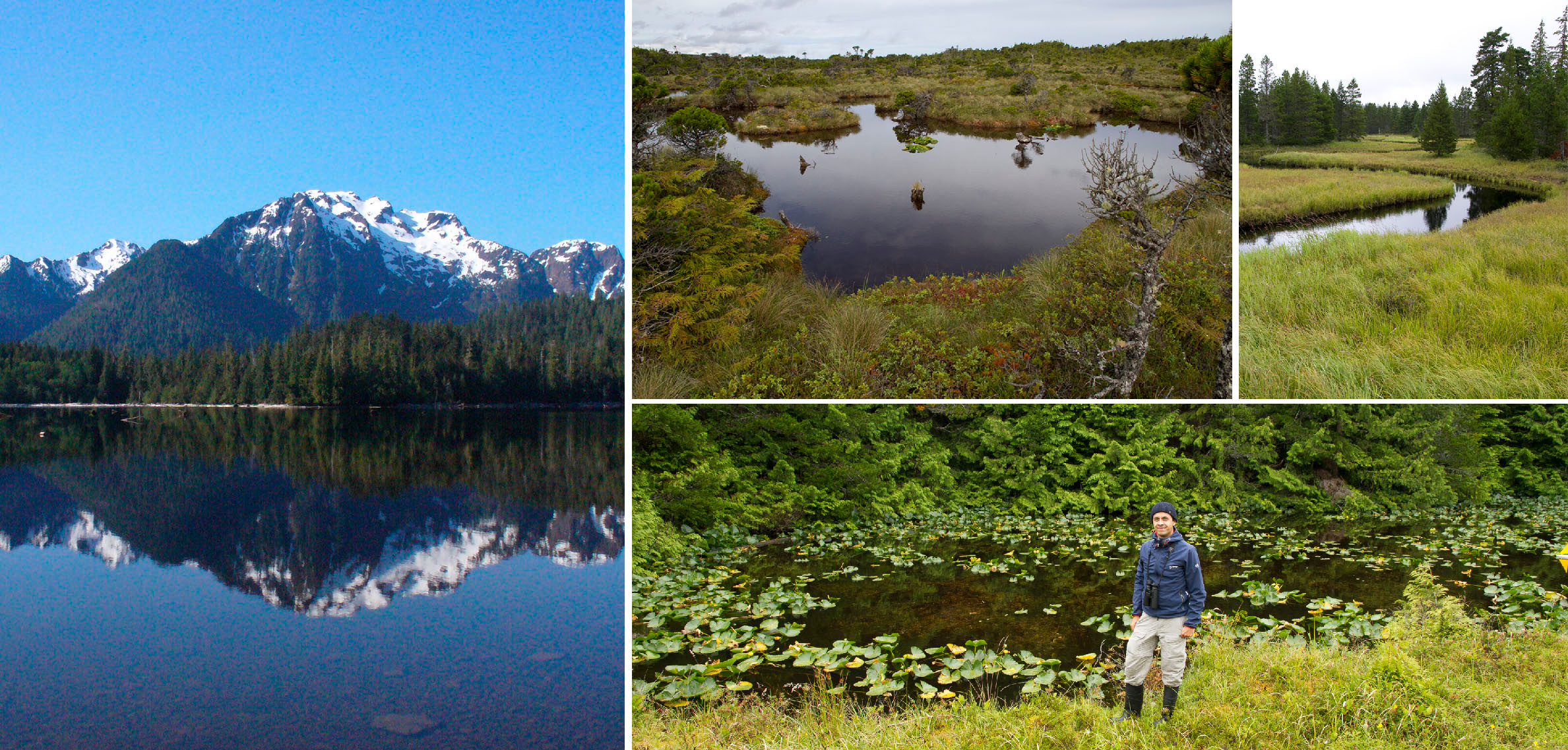 Haida Gwaii harbors a diversity of freshwater habitats, from large, deep lakes (left), to small shallow ponds (top middle), to streams (top right). In 1993, Tom Reimchen introduced 100 giant stickleback into a small, shallow clearwater pond (bottom right, Roadside Pond with co-author David Marques for size comparison). Photos: Thomas E. Reimchen (left), Gabriela Blatter (bottom right), David A. Marques.