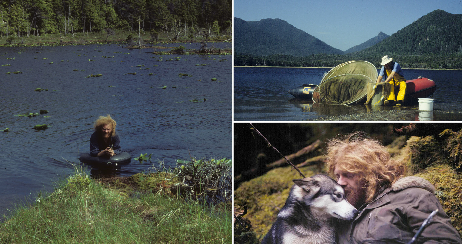 Tom Reimchen collecting stickleback in the Haida Gwaii archipelago in the 1970s-1980s.