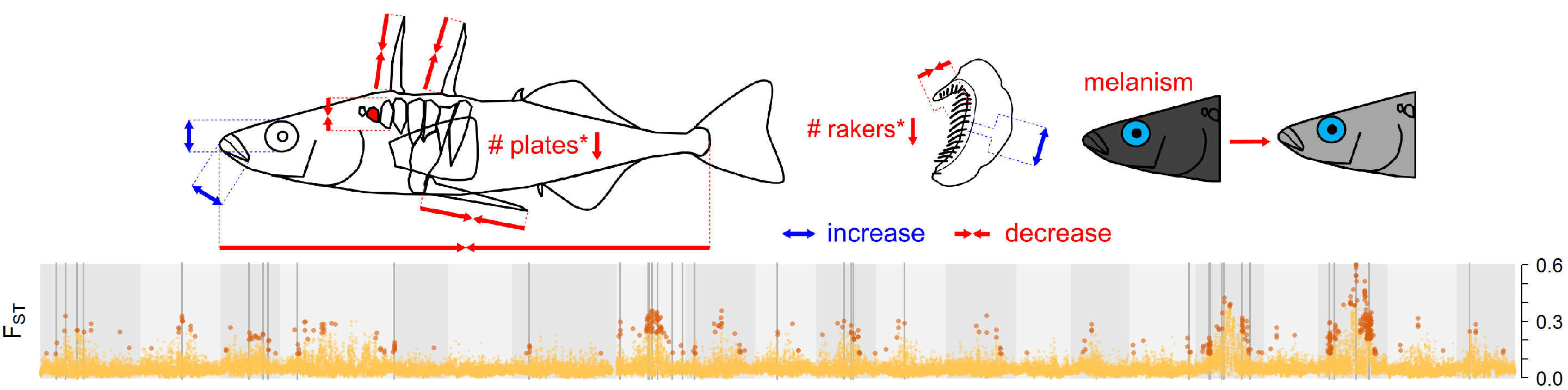 Phenotypic change and genomic differentiation (FST) between the source and transplant populations after 19 years of evolution in isolation. Grey bars indicate likely genomic targets of divergent selection across the 21 stickleback chromosomes (grey shading). Figures: Marques et al. (2018)6.