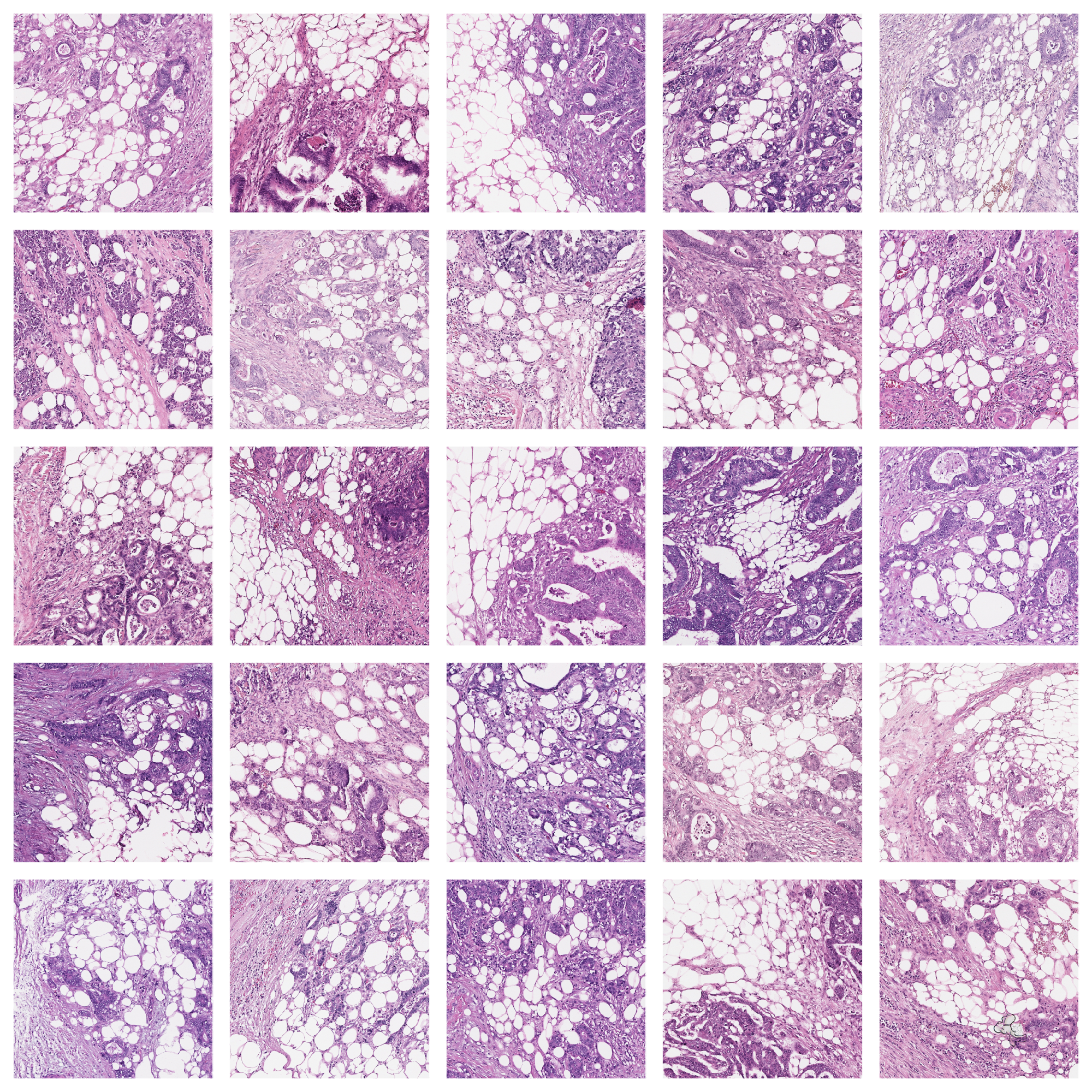 Left: H&E pathology slide with heatmap indicating locations of the independently prognostic Tumor Adipose Feature (TAF). Regions highlighted in red/orange are more likely to represent TAF according to the image similarity model, as compared to regions highlighted in green/blue or regions not highlighted at all. Right: representative collection of TAF patches across multiple cases. Pathologists and researchers who first reviewed a set of example patches such as these could reliably identify new examples of TAF patches.