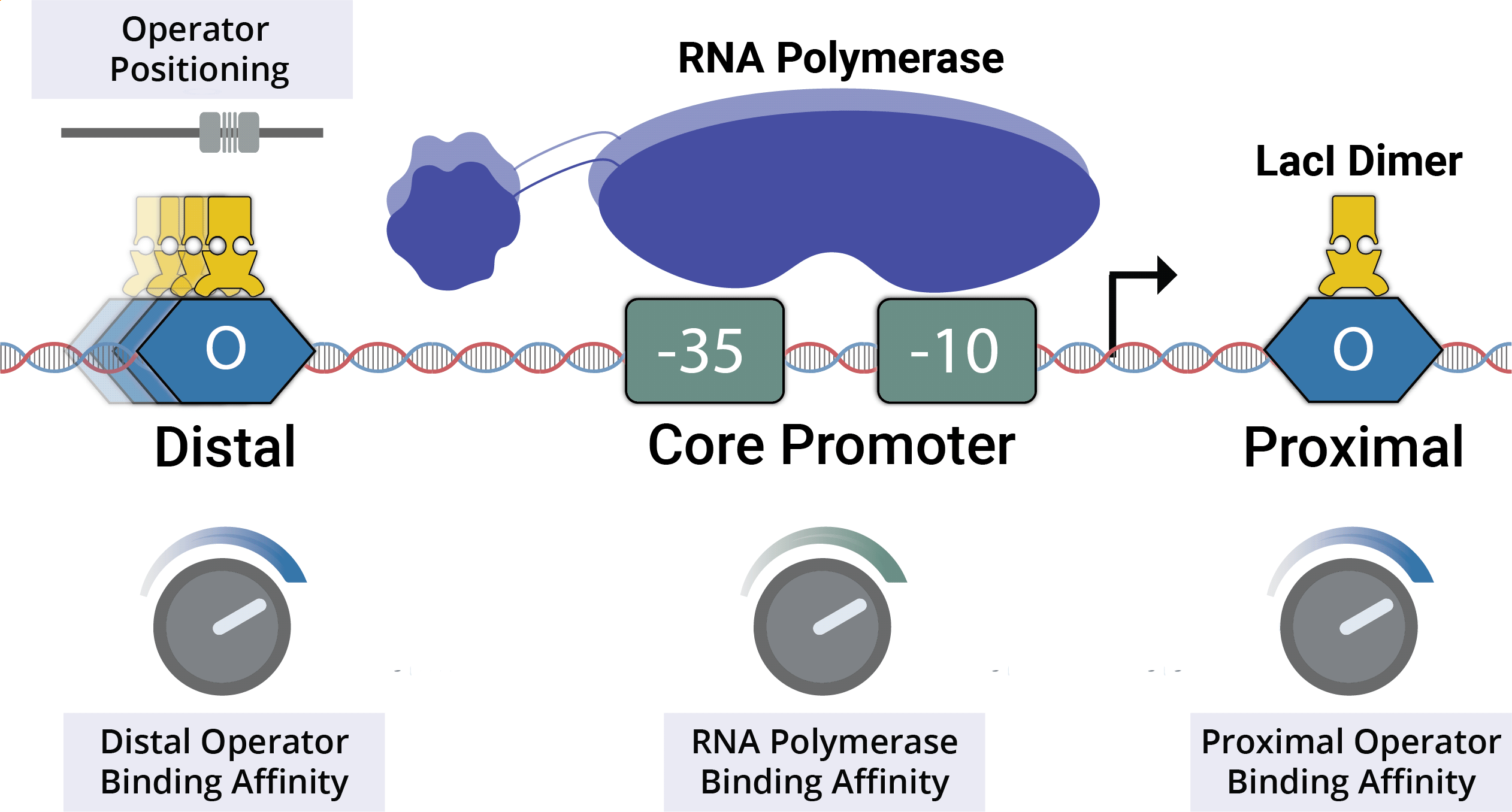 We used the classic lacZYA promoter as a model to learn how to design inducible promoters in bacteria. The lacZYA promoter sequence encodes binding sites that recruit RNA polymerase as well as a transcriptional repressor protein, LacI. When bacterial cells are exposed to an inducer molecule (lactose or IPTG), LacI becomes unable to repress the promoter allowing RNAP to transcribe. In this study, we synthesized and tested thousands of lacZYA variants made up of combinations of strong and weak RNAP and LacI binding sites to explore how tuning the strengths and positioning of these binding sites affects the inducible activity of the lacZYA promoter (Figure 1). A major takeaway from our results was that stronger LacI sites resulted in more inducible promoters, but using the strongest LacI sites led to surprisingly poor induction. This suggests that the strongest sites are not always ideal for designing inducible systems.