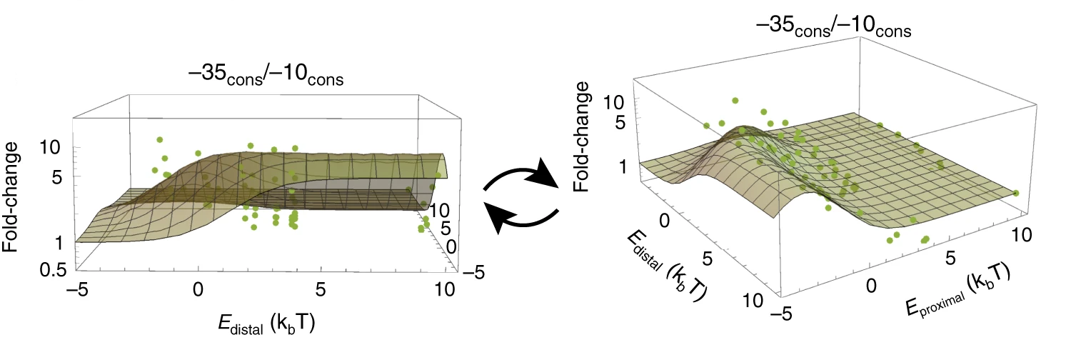 To explore this phenomenon more, we collaborated with the Phillips lab at Caltech, who used our data to train a thermodynamic model of lac promoter dynamics (Figure 2). This model provided two main insights. First, the model illustrated how to best optimize LacI and RNAP binding site pair to maximize fold-change. Notably, tuning LacI sites to proportional strengths as that of RNAP sites was crucial. Too strong and the LacI sites suppress the RNAP sites even during the induced 'on' state, too weak and the LacI sites are unable to suppress even in the uninduced 'off' state. Secondly, we found that training the model on just 5% of the data enabled us to make accurate predictions on the activities of the remaining held-out promoter data, suggesting that powerful models applicable to the vast space of promoter sequence variation could be generated with surprisingly little data.