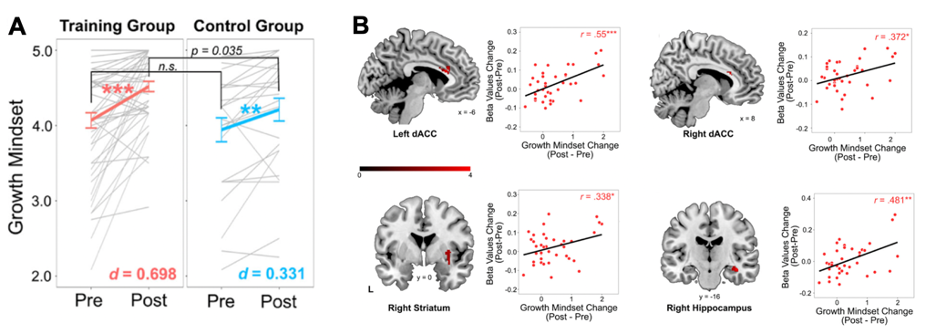 Figure 1. (A) Greater endorsement of growth mindset was observed in the training, compared to control, group at post-visit after the 4-week period. (B) Training-related increases in brain activation in dorsal anterior cingulate cortex (dACC) on the left and right side, right striatum, and right hippocampus during more difficult math problem solving were significantly correlated with growth mindset gains in the training group. Chen et al., npj Science of Learning 2022