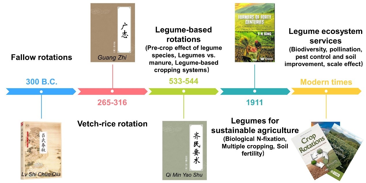 China has a long history of using legumes to maintain soil fertility for high yield (Fig. 1). Before 300 B.C., Chinese farmers normal recovery arable land soil fertility through fallow practice as recorded in the book ‘Lv Shi Chun Qiu’. The earliest records of legume utilization can be traced back to the Western Jin dynasty (265-316) in the book ‘Guang Zhi’, which summarized vetch-rice rotation in Southern China. About 300 years later, a great agronomist who lived in the Northern Wei dynasty, Sixie Jia, systematically summarized the advanced experience of legumes cultivation in his book ‘Qi Min Yao Shu’. In the early 1900s, Franklin Hiram King firstly introduced legume utilization of China to the world after his trip to Asia. He stressed that legume rotation and multiple cropping are the secrets of long-lasting soil fertility in China. In modern times, chemical fertilizers and pesticides have replaced some functions previously provided by legumes. However, with the concern about the negative environmental consequences, legume-based rotations gained renewed interest among the agricultural research community, farmers, and value chain actors.