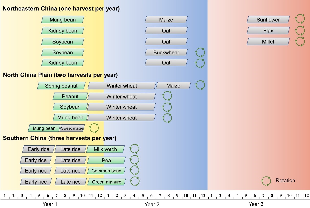 Fig. 2 Main patterns of legume-based rotations we designed and evaluated in three regions of China.