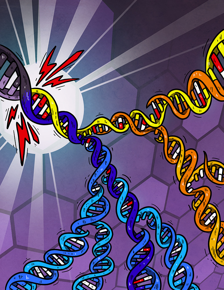 Cartoon illustrating DNA damage (red bases) generated independently on both strands of the DNA helix by a burst of an exogenous mutagen (lightning-bolt). Subsequent replication over the unrepaired damage incorporates the incorrect base (white) opposite damage which is resolved into a mutated DNA base-pair by later replication. Lesions can persist for multiple cell generations generating new combinations of mutation each time they are used as a template for replication. Artwork from Petra Korlevic @petrathepostdoc.