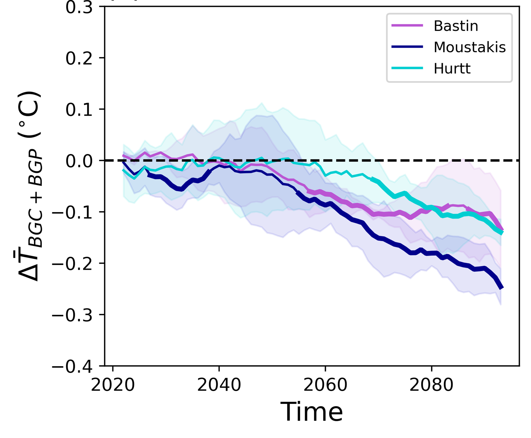 We got some surprising results: We found that although the Hurtt reforestation scenario uses roughly half the land of the Bastin scenario—a difference of 450 million hectares, or the size of the European Union—it achieved almost the same global cooling at the end of the century (see Fig. 1). Why? Because the Bastin scenario had large reforestation in northern regions like central Canada and Siberia which created large albedo-driven warming that effectively cancelled out some of the cooling related to the trees’ carbon uptake.