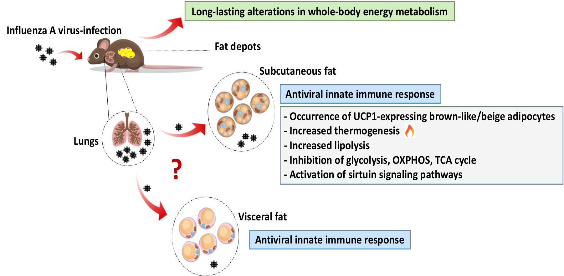 We studied the metabolic consequences of influenza A virus (IAV) infection in mice, and the impact of infection on the major fat depots (subcutaneous and visceral). We show that infected cells can be detected in both fat depots, where they initiate an antiviral innate immune response. Metabolic rewiring, characterized by repression of glycolysis, OXPHOS and TCA cycle, activation of sirtuin signaling pathways, and induction of UCP1-expressing thermogenic brown-like/beige adipocytes, occurred only in the subcutaneous depot (Figure).