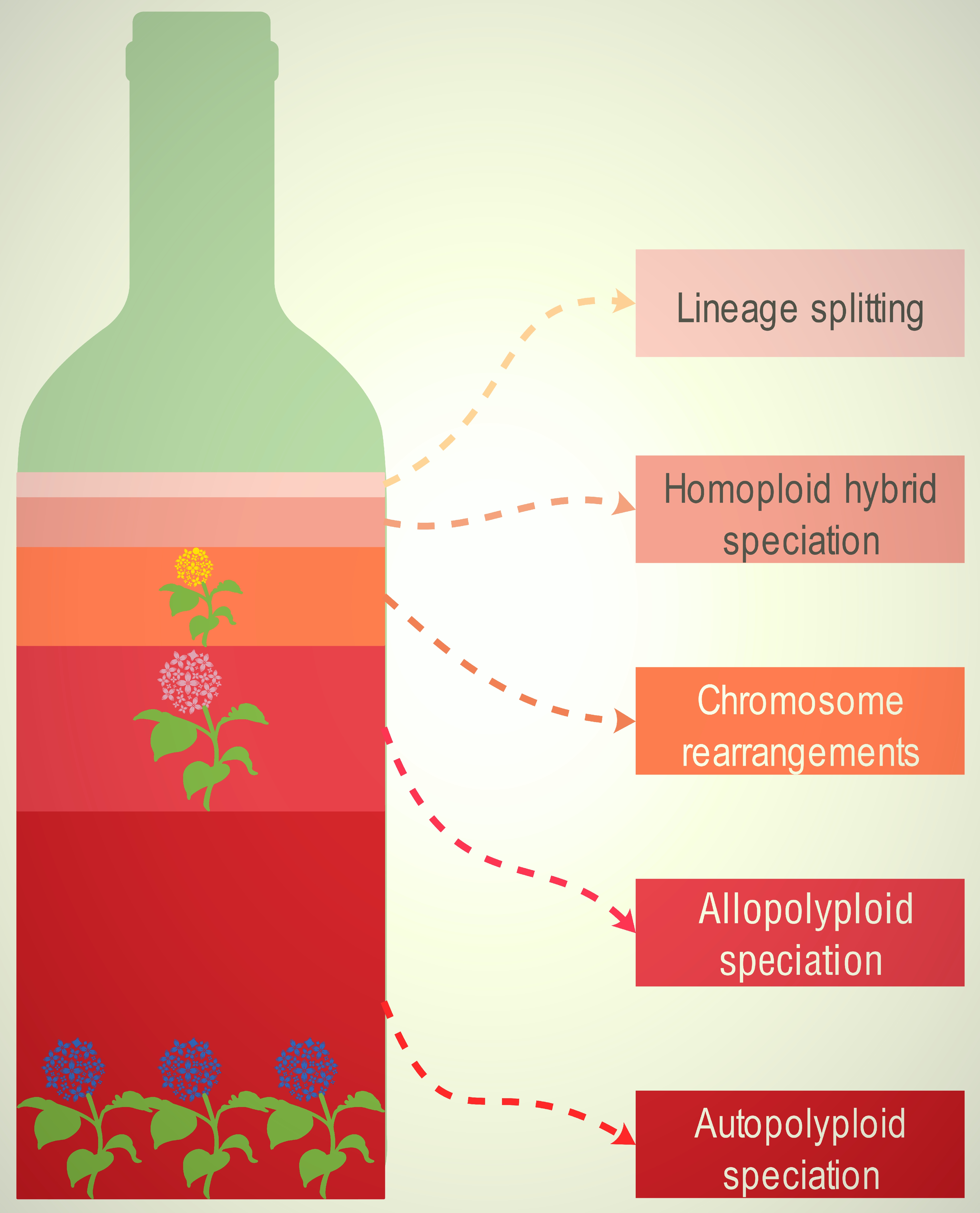Fig. 1. Five main types of plant speciation. Autopolyploid speciation is the dominant type in the context of climate change, followed by allopolyploid speciation, whereas speciation due to chromosomal rearrangements, homoploid hybrid speciation, and lineage splitting are not pervasive. Different colors on the wine bottle correspond to the proportions of the different speciation types.