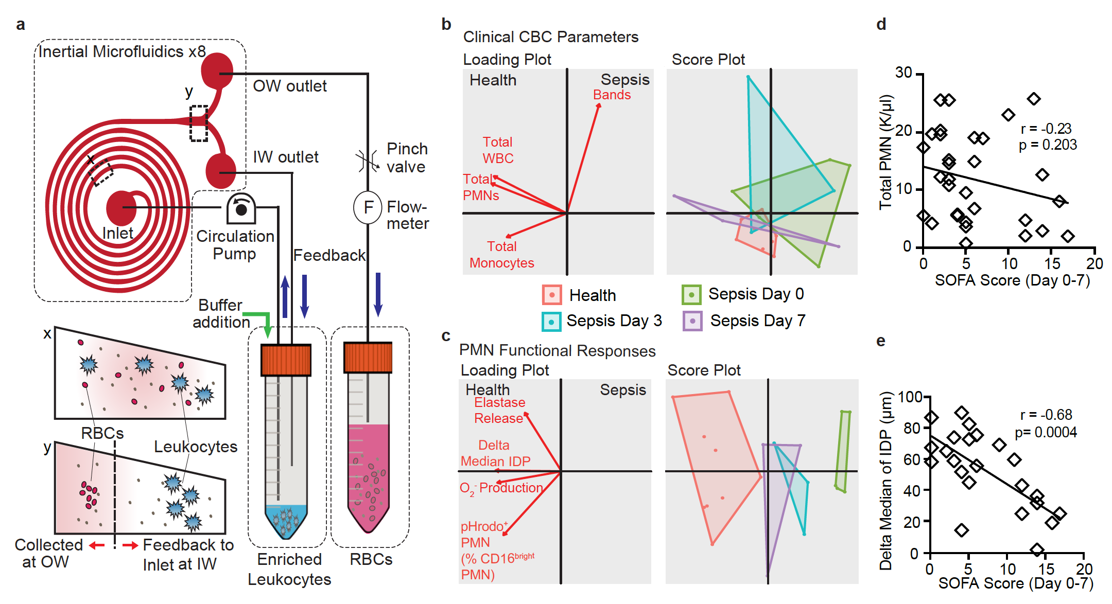 To address this important unmet clinical need, the research groups of Drs. Baron, Han, Levy and Voldman from Brigham and Women’s Hospital and Massachusetts Institute of Technology collaborated to develop a new bioengineering approach for leukocyte sample preparation in microliter quantities of peripheral blood that enabled routine assessment of leukocyte function. Just published in Nature Biomedical Engineering [6], we applied a closed-loop inertial microfluidic platform for label free isolation of leukocytes from a small aliquot of peripheral blood (50 μl) (Fig. 1a) and assessed leukocyte phenotype and function from a cohort of 18 hospitalized patients with sepsis and 10 healthy subjects. We demonstrated using repeated sampling of sepsis patients over 7 days that quantification of leukocyte phenotype and function outperformed the complete blood count parameters (Fig. 1b,c) and were more highly correlated to sepsis severity (Fig. 1d,e).