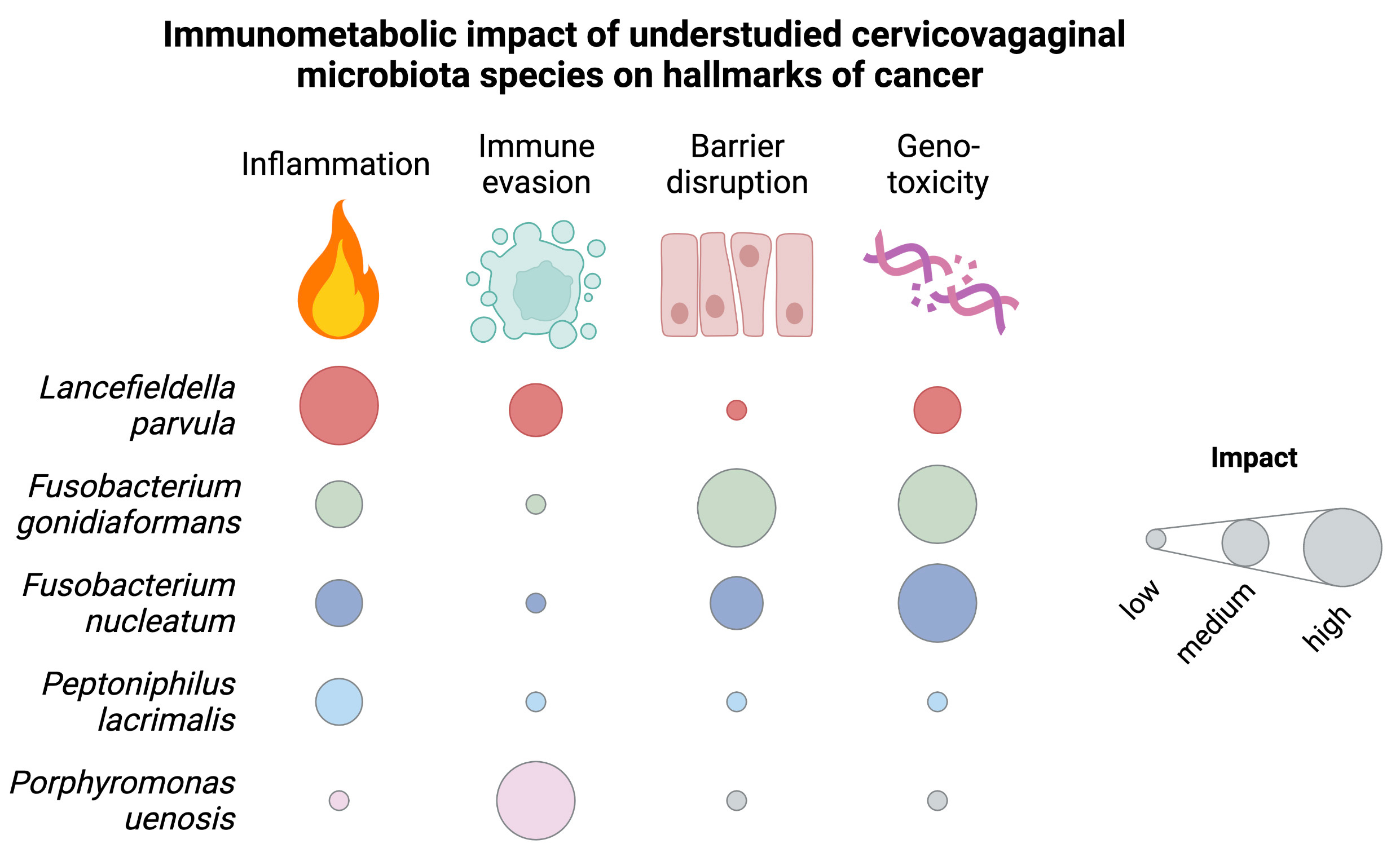 The association of specific bacteria with other malignancies are well established. For example, Helicobacter pylori is strongly associated with gastric cancer; Fusobacterium nucleatum, enteropathogenic Escherichia coli, and Bacteroides fragilis are associated with colon cancer. Numerous studies have investigated the mechanisms underlying the associations of these species with malignancy. In contrast, a paucity of research has been conducted into the pro-carcinogenic mechanisms of bacteria that have been associated with cervical cancer and other cancers of the female reproductive tract (FRT). Next-generation sequencing by 16S ribosomal profiling of women suggests that specific bacterial genera, such as Fusobacterium, Atopobium, and Sneathia, are associated with cervical cancer. We recently published a report in NPJ Biofilms and Microbiomes detailing the immmunometabolic profiling with these organisms (Laniewski et al., 2021). However, other genera, such as Peptoniphilus and Porphyromonas, have been associated with endometrial cancer and little data exists on tumorigenic mechanisms. These organisms are also associated with cervicovaginal dysbiosis and bacterial vaginosis. As such, we embarked on our study to investigate the immunometabolic mechanisms of select understudied BV-associated bacteria (BVAB: Fusobacterium gonidiaformans, F. nucleaum, Peptoniphilus lacrimalis, Porphryomonas uenonis, and Lancefieldella parvula) known to be associated with gynecologic malignancies. To achieve our goals, we coupled the use of our robust three-dimensional (3-D) human cervical cell model with an -omics approach using immunoassays and untargeted global metabolomics.