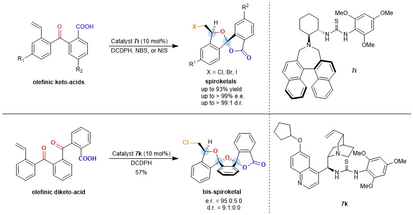 Interestingly, catalytic performance of the electron-rich thiourea derived from trans-1,2-diaminocyclohexane was far inferior to that of the traditional electron-deficient thiourea catalyst. The desired halo-spiroketals were obtained with excellent stereoselectivity (up to 99% e.e. and 99:1 d.r.). Halocyclization and bis-spiroketalization of the olefinic diketo-acid underwent smoothly to give the bis-spiroketal product in 90% e.e. when a cinchona alkaloid-derived electron-rich thiourea was used as the catalyst.