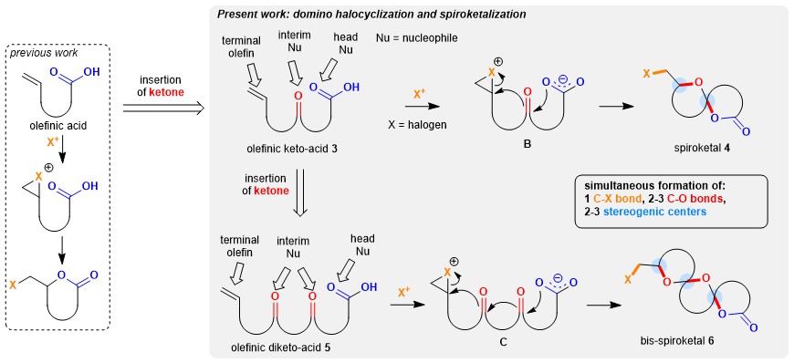 Inspired by the halocyclizations of polyenes3-4 and based on our experience on the asymmetric bromocyclization of olefinic acids5, we first designed the olefinic keto-acid substrates by introducing a ketone instead of an olefin as the interim nucleophile. We rationalized that spiroketals could be obtained via the domino halocyclization reactions of olefinic keto-acids.