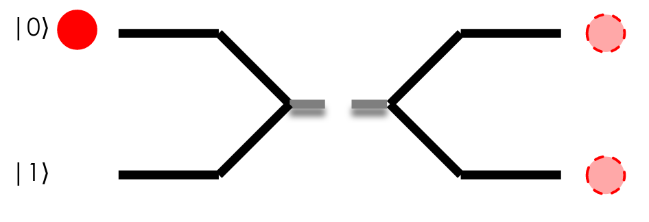 But what makes qubits different is that a quantum bit can take more than these two states. Let's take our photon and now pass it through a beam splitter, a mirror which reflects roughly half of all light which encounter it. A photon cannot be split in half, so it must have ended up in one of the two fibres, but we do not know which one it ended up in until we look for ourselves. We call this a superposition, a combination of the |0⟩ and |1⟩ states. This is analogous to Schrödinger's Cat, a thought experiment where a cat in a box could end up alive and dead at the same time. When we check which optical fibre the photon is in, the state collapses into either the |0⟩ or |1⟩ state, akin to opening the box and checking the status of our theoretical cat.