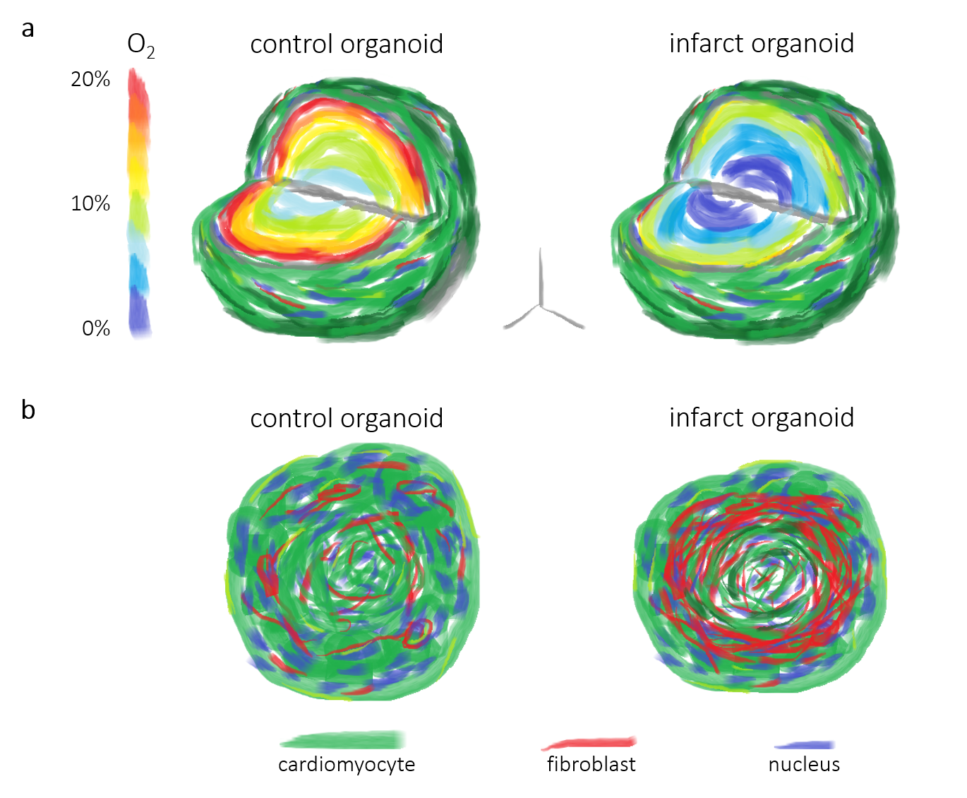 a, View of oxygen gradient within cardiac organoids in control and infarct organoids. b, Cross-sectional view of the functional/structural gradient as a result of the oxygen gradient in control and infarct organoid culture conditions.