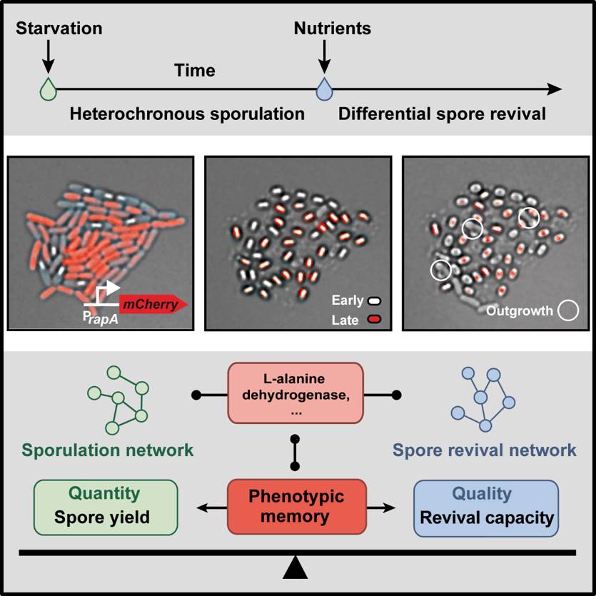 Sporulation affects spore revival via phenotypic memory but is the reverse also true? Indeed, on the timescale of evolution, spore revival could influence sporulation behavior due to selective pressures. The reason for this is a tradeoff between spore quantity and spore quality. This tradeoff emerges as a result of phenotypic memory, as suggested by both theory and a set of laborious experiments. In analogy to plant seeds and fish eggs where quantity-quality tradeoffs drive adaptations to different ecological niches, more responsive (i.e. high ‘quality’) spores might be selected when nutrient upshifts are rather weak, hence driving evolution towards a more rapid sporulation dynamics. Phenotypic memory could thus link selection pressures acting at quite different times and life cycle stages to produce unexpected connections between states.