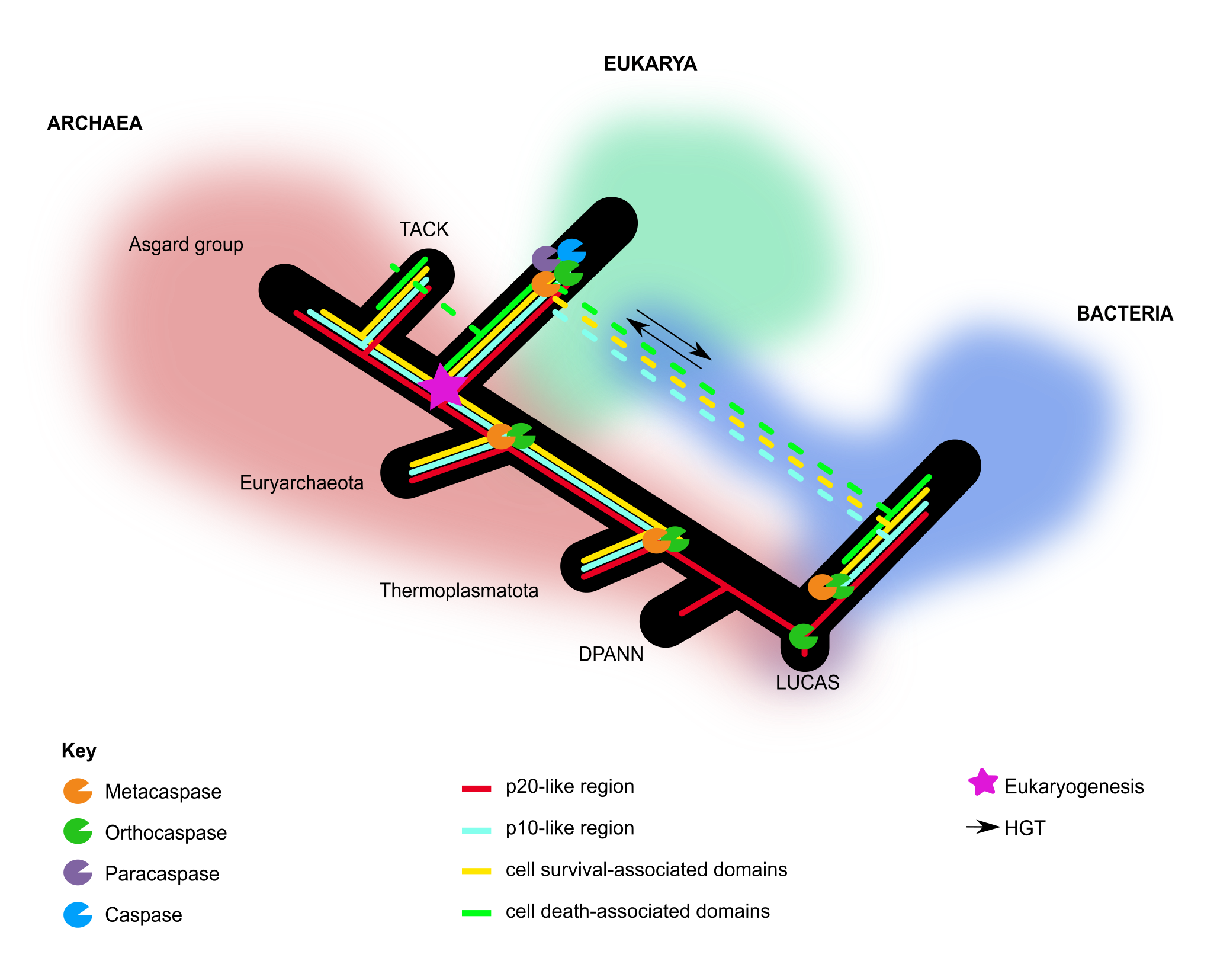 Figure 2 Proposed acquisitions of the different C14 peptidase-accompanying domains and their associated pro-survival or pro-death domains in archaea.