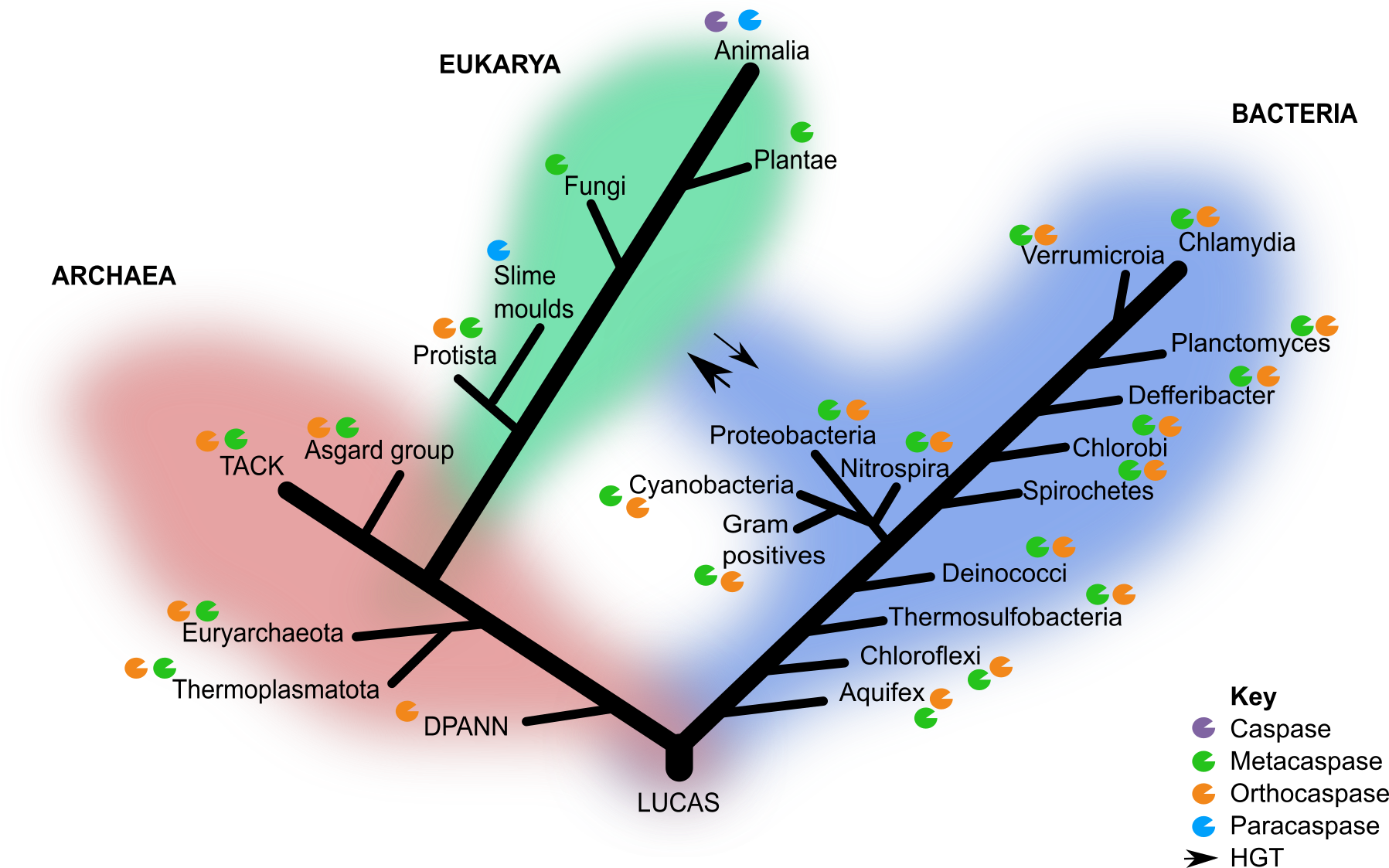 Figure 1 Canonical 3-domain tree of life with caspase homologs. Only the groups of interest included in this study are indicated. HGT events between the domain eukarya and bacteria are indicated by the arrows and thickness indicates the frequency of the event.