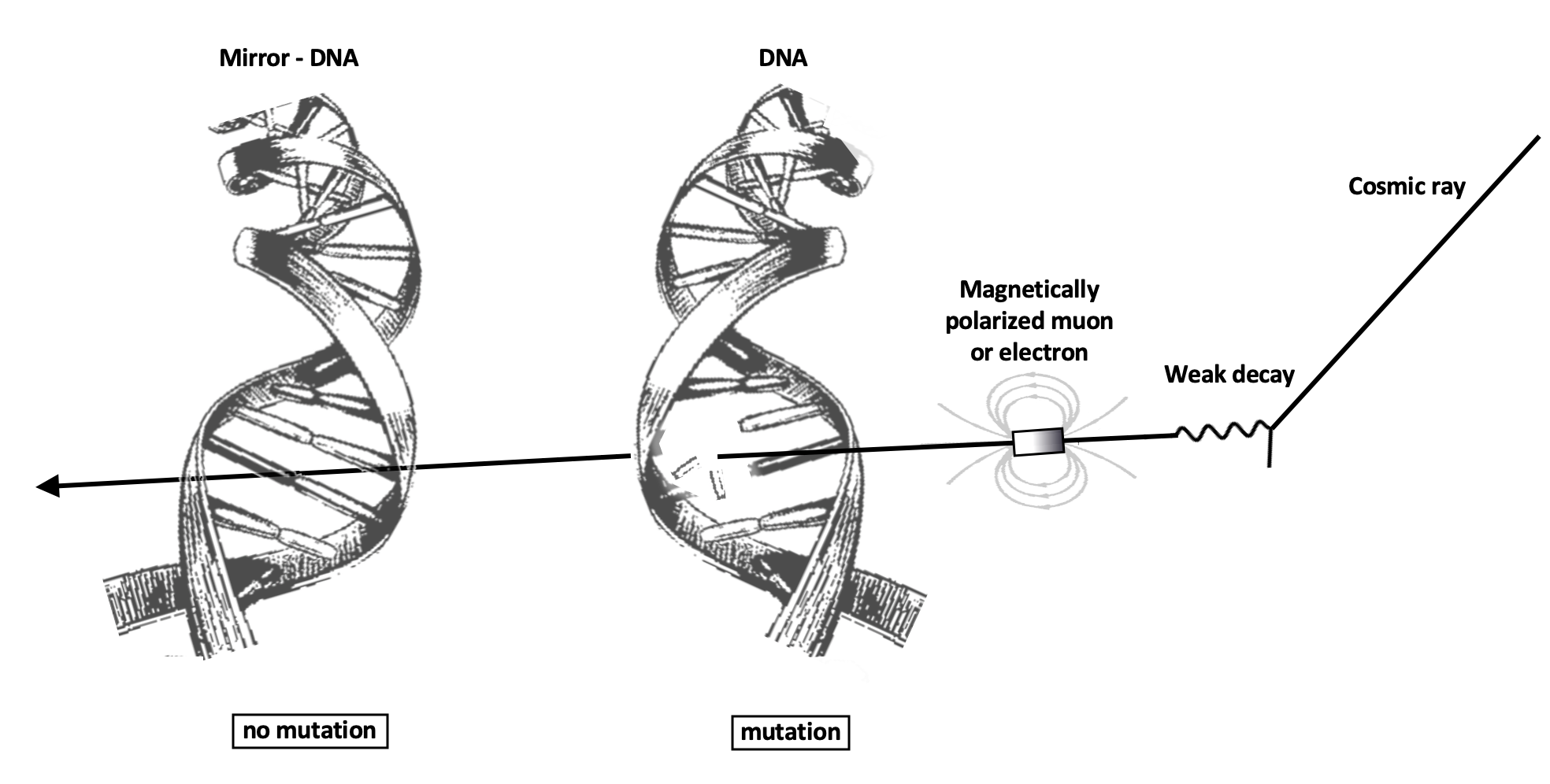 Our own background is in cosmic ray physics and our contribution to this long and interesting discussion is to suggest that it is the cosmic rays, mostly relativistic protons that bombard the earth, that impose the handedness through the weak interaction. Now, cosmic rays are known to be important biologically and they are responsible for inducing genetic mutations. At low levels they are beneficial and allow evolution to happen. However, irradiation at high levels, during a reactor accident or on the surface of Mars during a solar flare, can be harmful or even lethal. The secondary particles that cosmic rays produce, specifically muons, are extremely penetrating and will reach essentially all sites where life could have started. They create electrons and positrons, which can carry tiny magnetic moments pointed preferentially in a direction opposite to their velocities. These “polarized” electrons can interact directly with biological molecules and liberate or ionize electrons from them, and this can eventually lead to mutations. The rate at which this happens, during steps three and four, has only a tiny bias, preferring one chiral system over the other. By itself, this bias is inconsequential, but if we combine it with billions, or even trillions, of generations of “living” biomolecules it can be amplified so that only one choice remains.