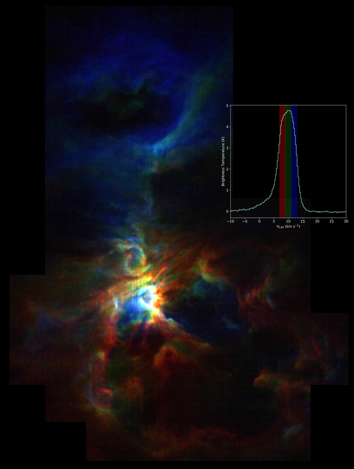 Figure 1: 3 RGB color Ionized carbon map of SOFIA taken with the upGREAT receiver. Red is an integrated image from 7 to 9 km/s, green from 9 to 11 km/s and blue is 11 to 13 km/s. The inset plot shows the average spectrum of the entire map with the RGB velocity ranges overplotted, each map pixel is made of individual spectrum allowing astronomers to disentangle the kinematics of the region.