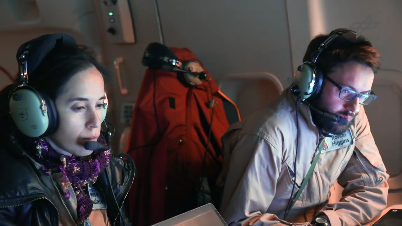 Figure 3: Denise Riquelme (Max Planck institute for Radio Astronomy) and Ronan Higgins (Co-author, University of Cologne) inspecting the data during flight