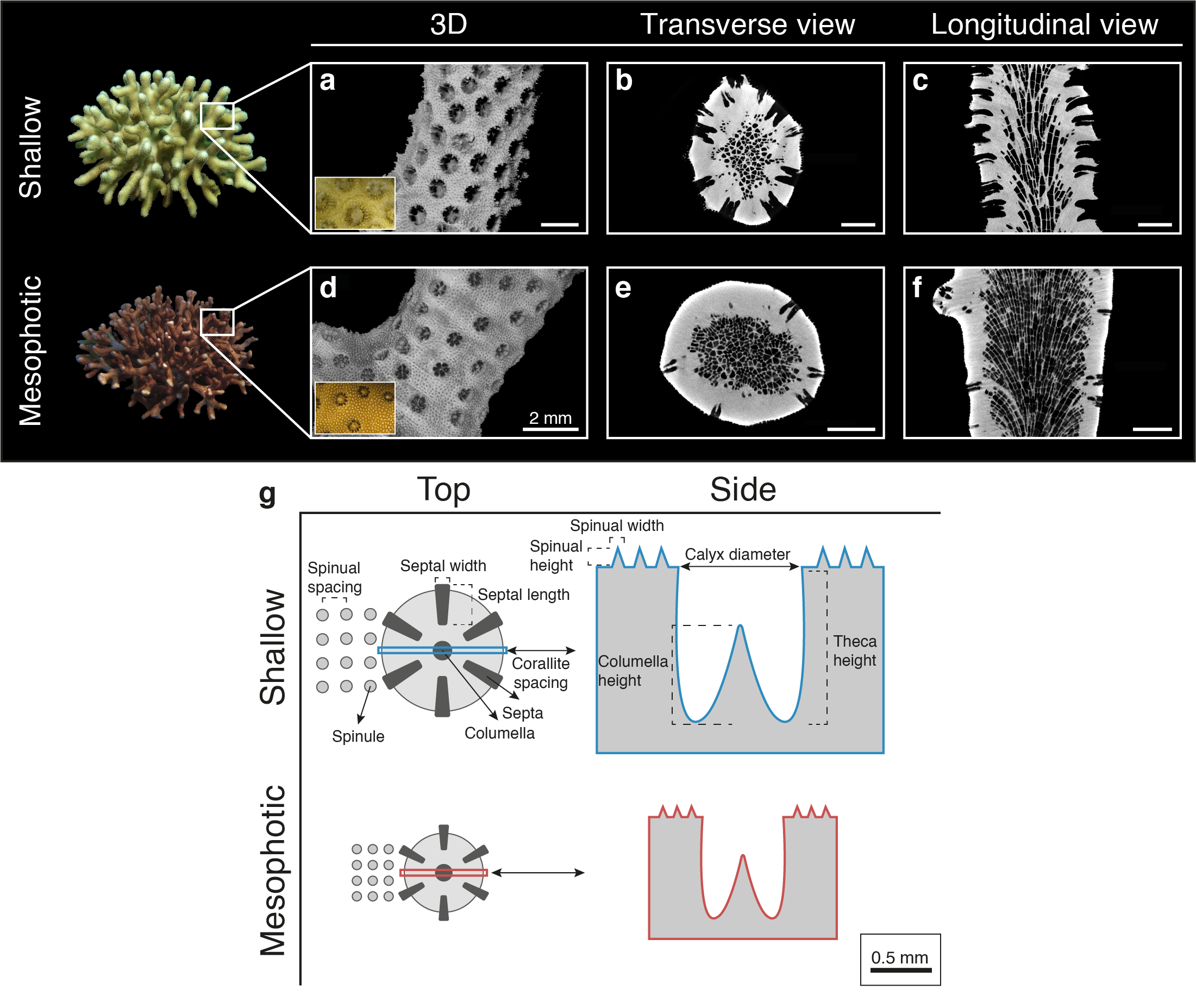 Second, we were interested in further examining how these changes in the small-scale 3D morphology influence the coral's ability to capture light and photosynthesize at both depths. To examine this, we applied a novel method by which to determine the functional significance of small-scale morphological traits with respect to the coral's internal irradiance distribution. We have integrated our morphometric results with our recently obtained photosynthetic and optical data3, and developed 3D light propagation models (using Monte Carlo simulations). Our simulation results suggest that small-scale morphological traits influence in-hospite light distribution and absorption, consequently affecting coral photosynthesis. The change in the length scale of morphological traits found within each of the two depth groups was shown to benefit the photosynthetic output with respect to their natural surrounding light regime. Our light models indicate that in total, the mesophotic architecture provides a greater ability to use solar energy under limited-light conditions compared to the shallow architecture, specifically by increasing the surface area to volume ratio on the corallite scale.