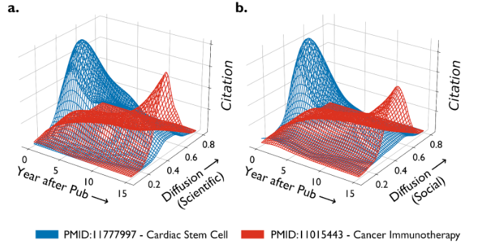 Fig. 1: Representation of different diffusion levels and contrasting diffusion trajectories. Panels a and b illustrate 3D kernel density plots of diffusion indices and citations for PMID 11777997 (Cardiac Stem Cell) and PMID 11015443 (Cancer Immunotherapy) in scientific and social spaces, respectively. Publication years associated with each article are aligned to zero for comparison. Annual diffusion indices and citation counts are computed using a two-year rolling average.