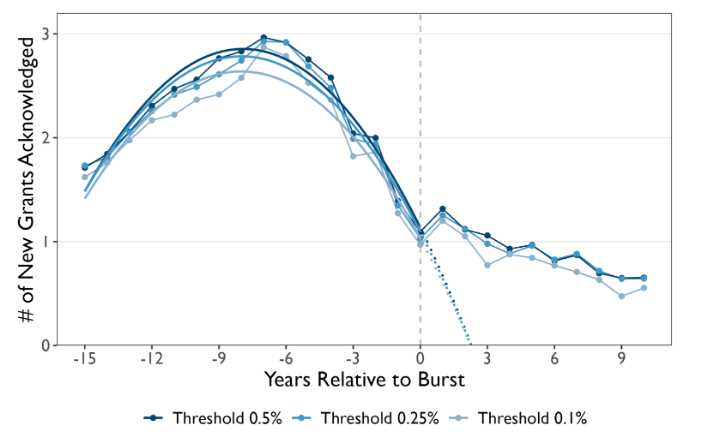 Fig. 3: The average number of new grants acknowledged in collapsed subfields by years relative to burst. The quadratic fit is applied to data from years -15 to 0 relative to the burst year, with dotted lines representing extrapolations starting from year 0 onwards.