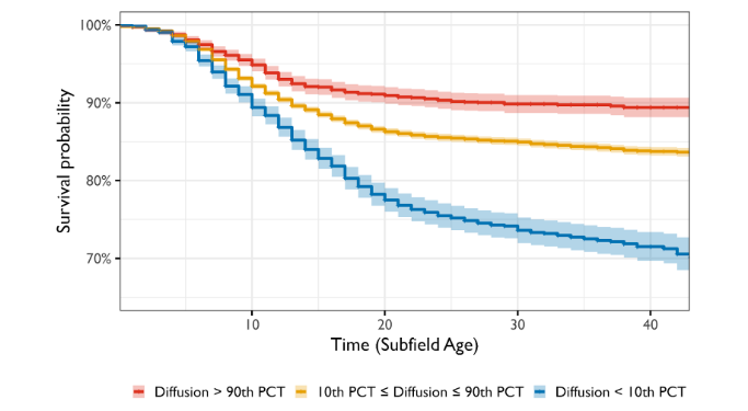 Fig. 2: Survival probability against bubble bursting as a function of knowledge diffusion in social space. Events are defined as a sharp decline in 2-year citation counts at the subfield level with a 0.5% cutoff (see Method). Survival refers to the converse, i.e., not experiencing a subfield-level extreme deflationary event. Subfield ages are set to 0 in the year when the focal seed article spanning the subfield was published. Diffusion percentiles are ranked within calendar years and subfield ages. The crosses denote the estimated mean survival probabilities at a given subfield age, and the bands depict 95% confidence intervals.