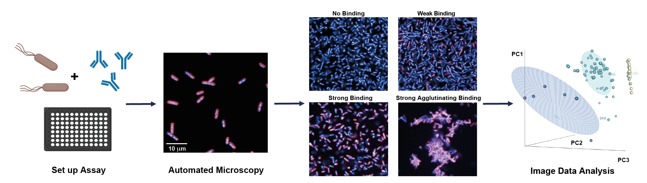 Antibody binding analysis using high-content imaging: bacteria are incubated with antibody in 96-well plates, then stained using DAPI and Alexa Fluor-647 secondary antibody and imaged using an Opera Phenix microscope. Different binding phenotypes can be classified using image analysis. (schematic was created using icons from BioRender.com)
