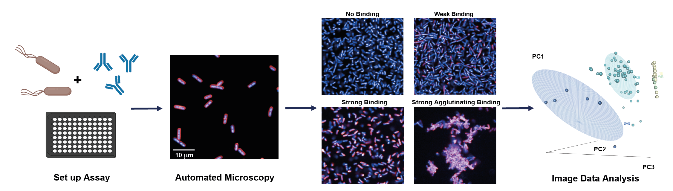 Antibody binding analysis using high-content imaging: bacteria are incubated with antibody in 96-well plates, then stained using DAPI and Alexa Fluor-647 secondary antibody and imaged using an Opera Phenix microscope. Different binding phenotypes can be classified using image analysis. (schematic was created using icons from BioRender.com)
