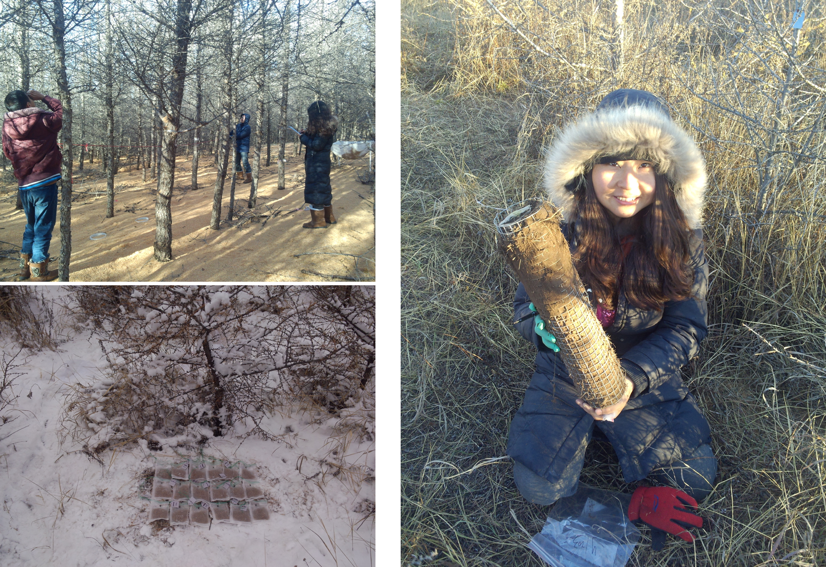 Fig 3. Meifeng Deng and the other students sample litter and soil cores, and set up litter decomposition experiment at the Saihanba larch plantation (Credit Lingli Liu)