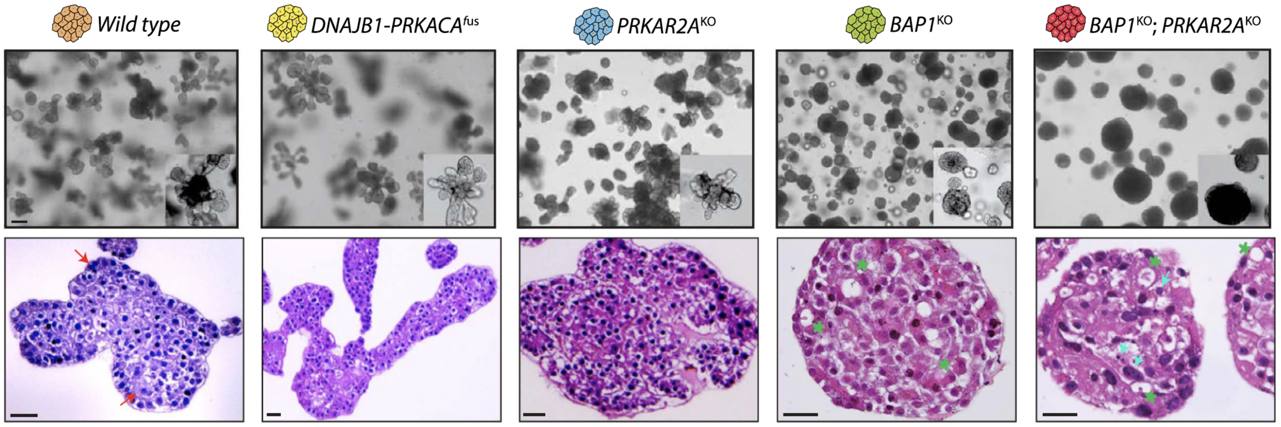 We set out to model these two different genetic FLC backgrounds in human hepatocyte organoids to understand the role and biological consequences of each specific FLC mutation6. To our surprise, we noted drastic differences between DNAJB1-PRKACAfus organoids versus BAP1KO;PRKAR2AKO organoids. On a histological level, the fusion-bearing organoids retained a phenotype that was more alike wild type organoids, while BAP1-mutated organoids appeared more transformed: they adopted a circular shape, turned dark, and displayed nuclear dysplasia.