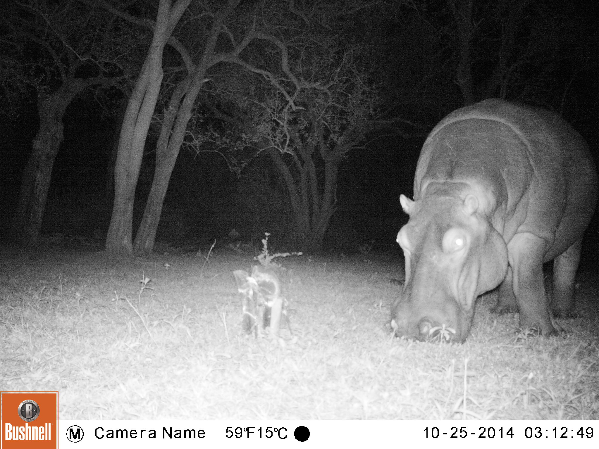 Hippo feeding at night in Hluhluwe-iMfolozi Park captured by a camera trap. Photo credit: Joris Cromsigt