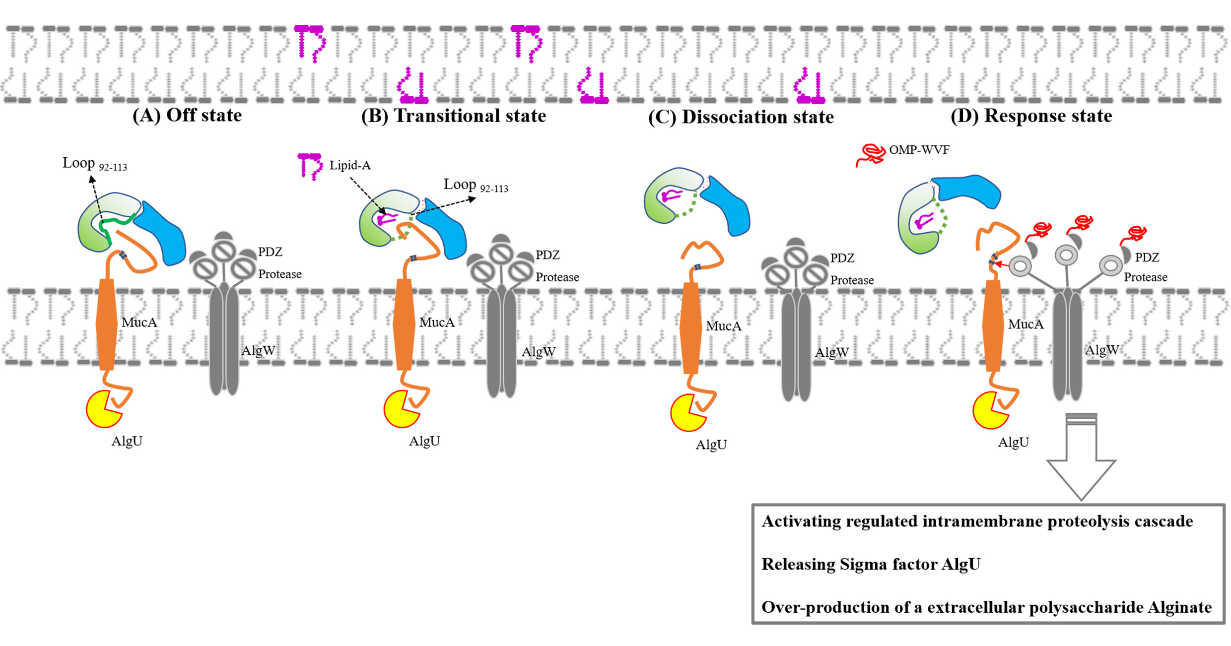 Figure 1. The model of MucA-MucB conformational conversions in response to amphiphilic effectors like lipid signals.