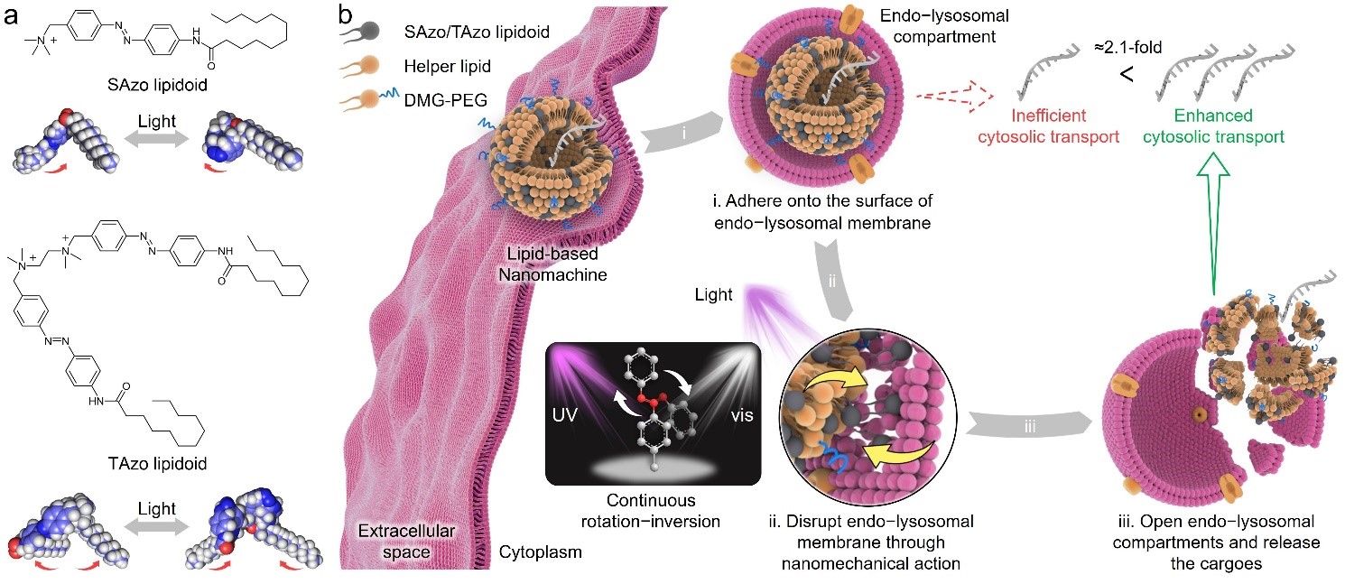 We designed an azobenzene (Azo)-based lipid that can convert light energy into mechanical movements (Fig. 1). Doping this Azo-based lipid into the LNP, a lipid nanomachine (LNM) is formed to realize our hypothesized function. Specifically, the Azo-based lipids in LNMs are in a reversible form of compact cis- and extended trans-isomers in response to the irradiation with ultraviolet (UV, 365 nm) and visible light (Vis, >400 nm), respectively. In the presence of simultaneous UV and Vis (UV/Vis) irradiation, the Azo-based lipids in LNMs undergo continuous rotation−inversion and stretch−shrink movements. As a result, after the LNMs enter the cells via endocytosis, the Azo-based lipids act as rotors continuously destabilizing the endo-lysosomal membrane and enhancing the release of the cargos.