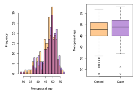 Only about 20% of the participants had reported menopausal age, even though the mean age at baseline was 52.7 years, thus it is reasonable to believe that more than half of the study cohort was in fact postmenopausal at baseline. For those that had reported menopausal age, the average age was lower for the controls than for the cases, however, the difference did not reach statistical significance.