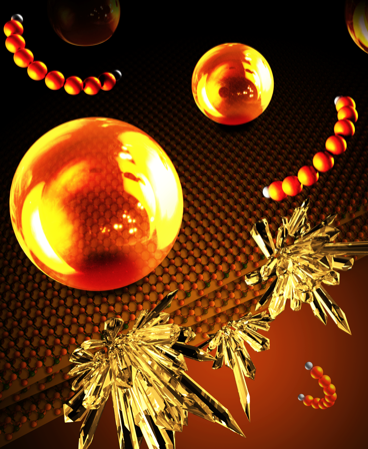 Figure 1. Liquid sulfur droplets on the basal plane and solid sulfur crystal from the edges of molybdenum disulfide (MoS2).