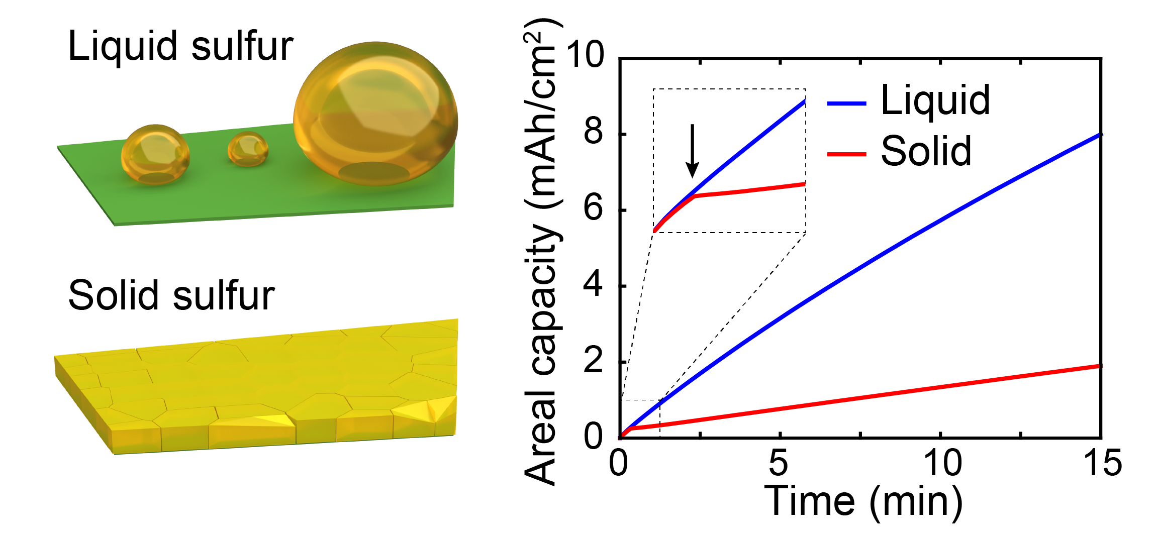 Figure 2. Liquid and solid sulfur provide very different areal capacities. (Cartoon courtesy of Xiaoyun)