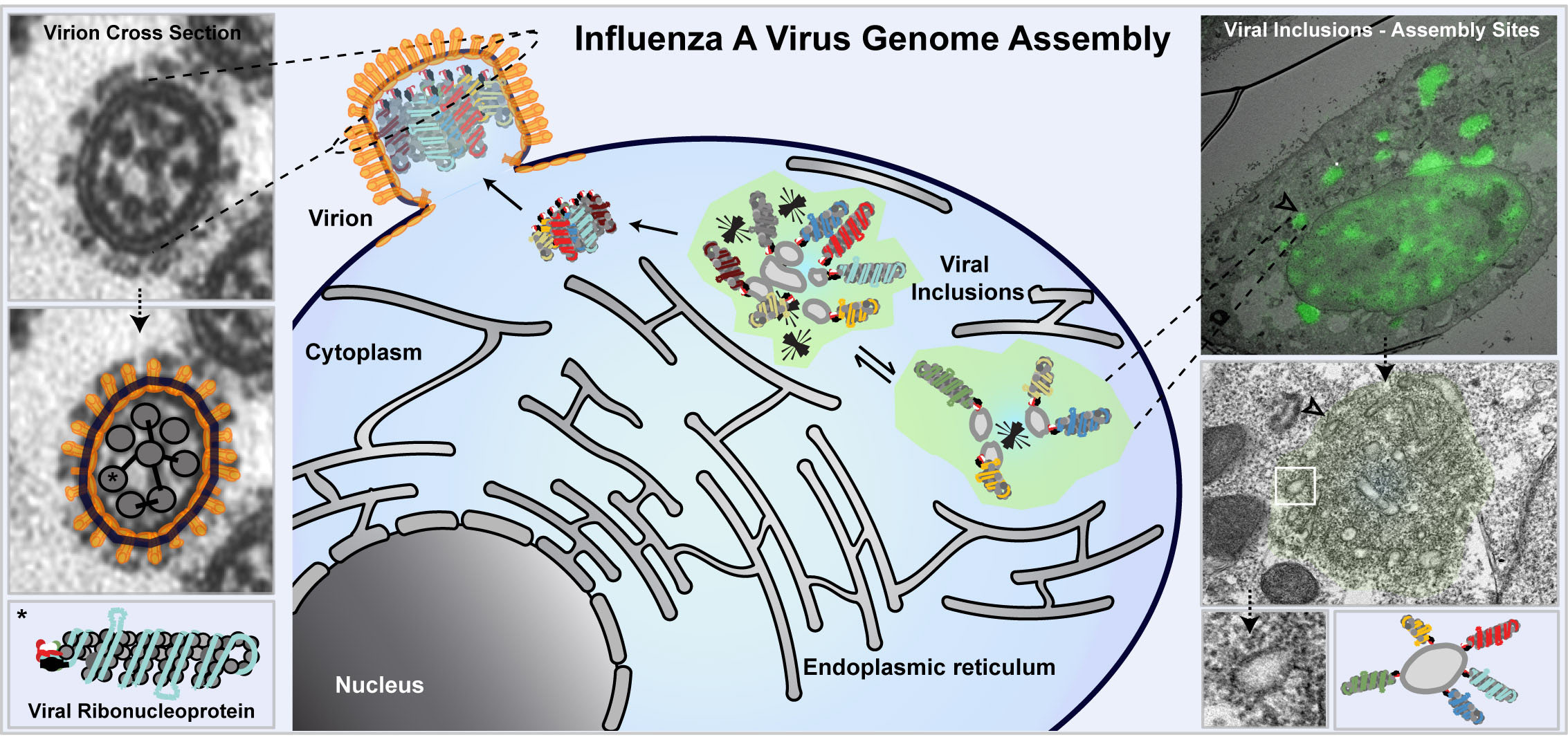 Influenza A virus (IAV) contains a segmented genome composed of 8 different RNAs in the form of viral ribonucleoproteins (vRNPs). Virions do not contain more than 8 segments and each segment is included once. This agrees with seminal work showing that the assembly of IAV genome is a complex selective process1-6. Segmentation is, however, advantageous to the virus as, in combination with the high mutation rate of the viral RNA polymerase, accelerates viral evolution which is the underlying cause of yearly epidemics. In addition, it permits genetic mixing of different parental strains through re-assortment, which originates pandemic genomes associated with severe outbreaks. This has motivated the Cell Biology of Viral Infection group, at the Instituto Gulbenkian de Ciência in Portugal, for the past 6 years, to explore the host mechanisms involved in the assembly and re-assortment of IAV genomes.