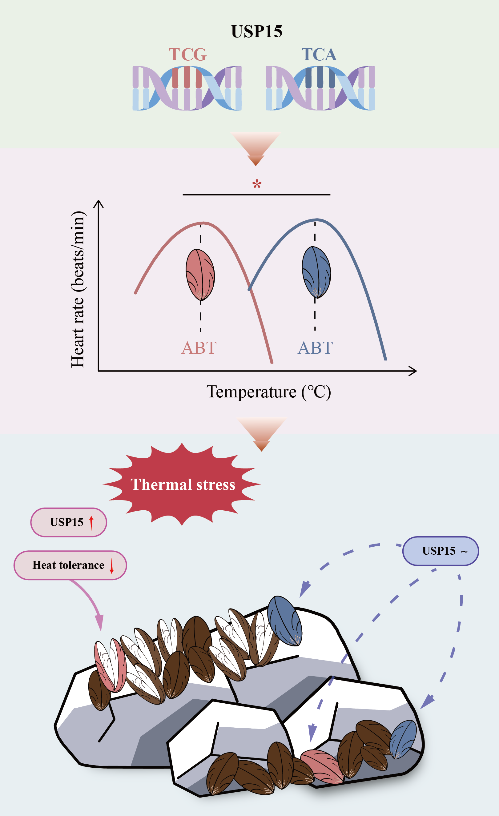 Following this trail, Chao-Yi and Yue conducted experiments and analyses on how this substitution influences the USP15 expression profiles. Interestingly, facing sublethal temperatures, the wild-type mussels namely those carrying no mutation exhibited higher inter-individual variations in USP15 expression than the mutant mussels carrying the synonymous mutation. More interestingly, the variations in USP15 expression were also related to microhabitat heterogeneity, only those wild-type mussels from sun-exposed habitats showed excessive up-regulated expression. because the USP15 was the powerful inhibitor of mitophagy, one protective mechanism when organisms face high temperatures, the excessive upregulation could potentially lead to lethal effects.