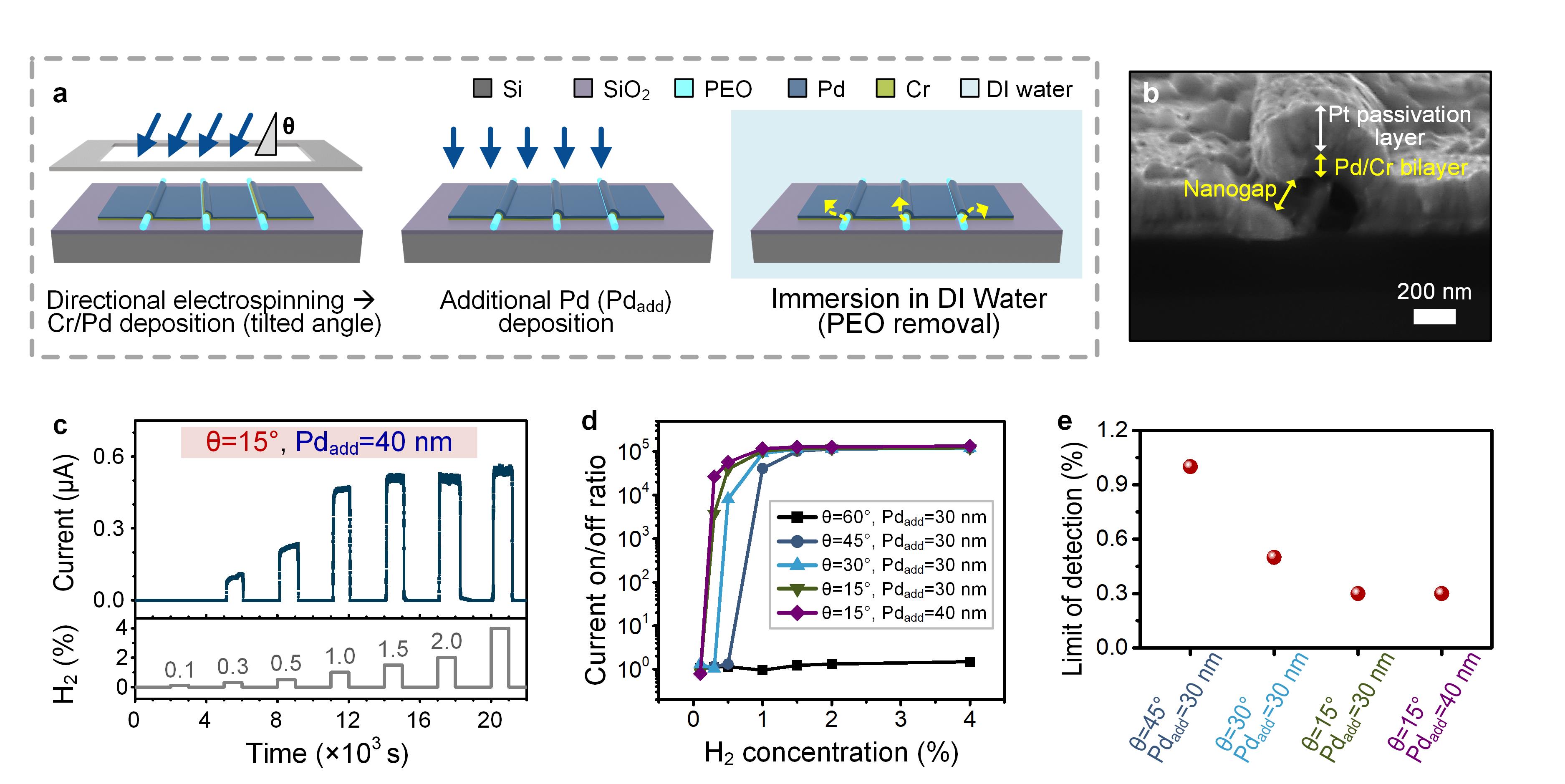 a Schematic illustration of the summarized fabrication process. PEO nanofibers were first formed by directional electrospinning as sacrificial templates, followed by tilted angle deposition of Cr and Pd, additional Pd deposition, and PEO removal. b Cross sectional SEM image showing the nanogap and bilayer structure. c An example of switching responses of the device under increasing hydrogen concentrations. d Current on/off ratio as a function of hydrogen concentration for different fabrication parameters. e Hydrogen detection limit for devices fabricated with different tilted deposition angles and additional Pd layer thicknesses.