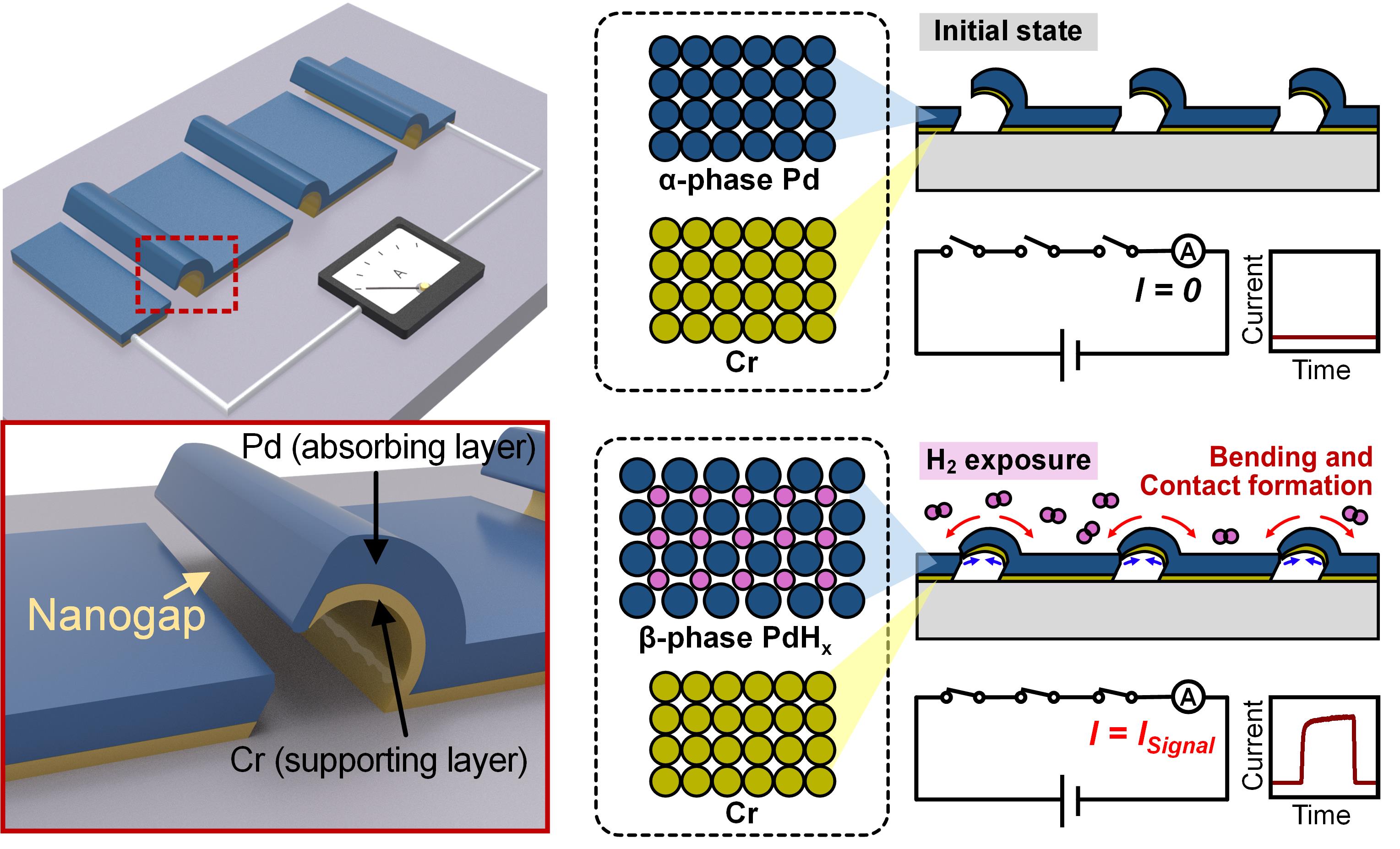 In the initial state, the suspended bilayer remains separated from the counter electrode by a nanogap, so the circuit stays open and essentially no current flows, meaning near-zero standby power. Notably, Pd is a well-known hydrogen absorbing material. When exposed to hydrogen, Pd incorporates hydrogen atoms into its lattice and undergoes volume expansion, while Cr is mechanically stable. When hydrogen is introduced, the Pd layer transforms from α-phase Pd to β-phase PdHx and expands. This expansion induces bending in the bilayer, and once the deformation is large enough, the suspended structure makes physical contact with the opposite side electrode. The result is a clear electrical transition from the off state to the on-state with a higher current on/off ratio over 105. Rather than relying on small, continuously varying resistance changes, the device produces a distinct switching response with a high current on/off ratio through physical contact formation.