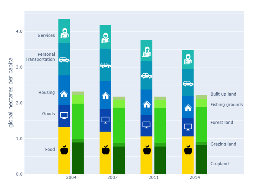 A team of food system experts and sustainability scientists – coordinated by Global Footprint Network’s researchers – have investigated the Ecological Footprint (i.e., the appropriation of biological resources and ecosystem services to support consumption patterns) of the EU-27 and unraveled the contribution of the food component vis-à-vis the policy targets of the EU Green Deal and the Farm to Fork strategy. Understanding the evolution of the Food Footprint in the decade 2004-2014 (the most updated due to data availability) enabled researchers to track the impact of societal trends (namely dietary patterns) on the environment. Alternative policies and interventions, and their potential outcomes are also described. The methodology used consisted of an Ecological-Footprint-Extended Multi-Regional Input-Output (EF-MRIO) approach, accounting for demand, supply and trade, and considering multiple externalities.