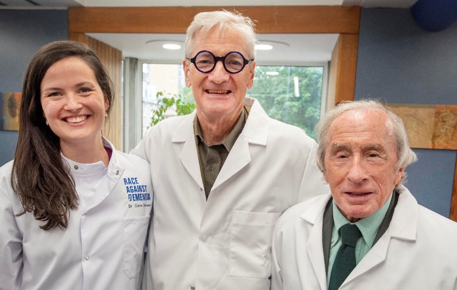 Dr Claire Durrant, Sir James Dyson and Sir Jackie Stewart celebrating the launch of the Dyson-RAD Dementia Research Acceleration Project