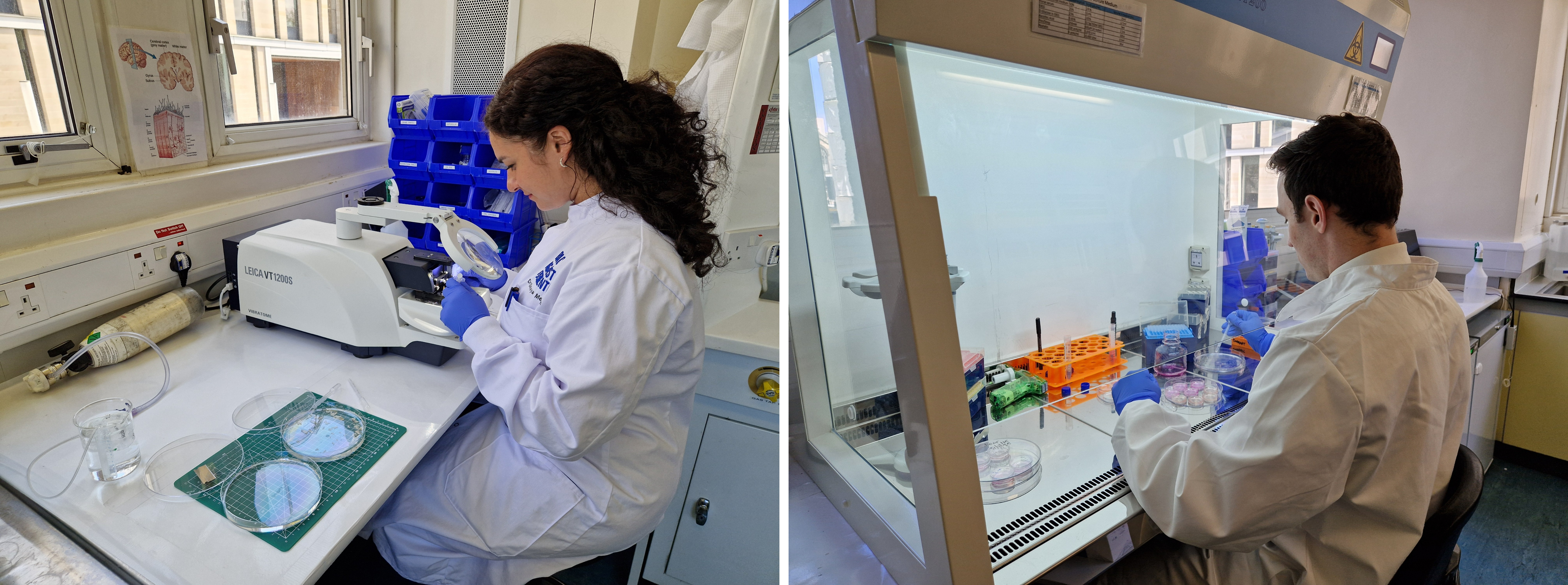 Left: Dr Soraya Meftah processing live human brain using a vibratome. Right: Dr Robert McGeachan plating human brain slices into culture dishes.