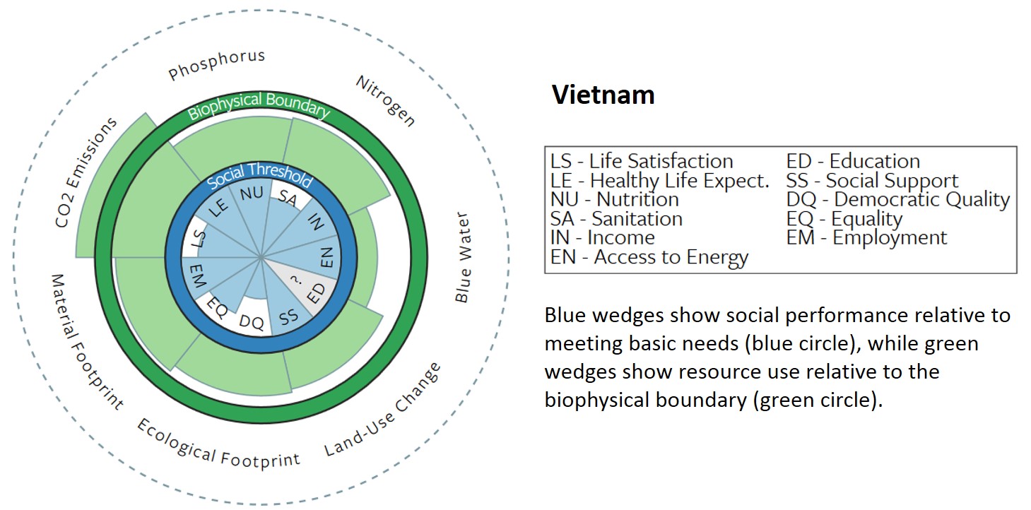 When we finished the analysis, which included 11 social indicators linked to the UN Sustainable Development Goals, and 7 environmental indicators linked to the planetary boundaries framework, the results were clear — but depressing. Of the 151 countries we analysed, no country achieved the basic needs of its citizens at a globally sustainable level of resource use. In general, the better that countries did on the social indicators, the worse they did on the environmental ones. The closest thing we found to an exception was Vietnam, which only transgressed one biophysical boundary (CO2 emissions) while achieving 6 of the 11 social thresholds (see below).