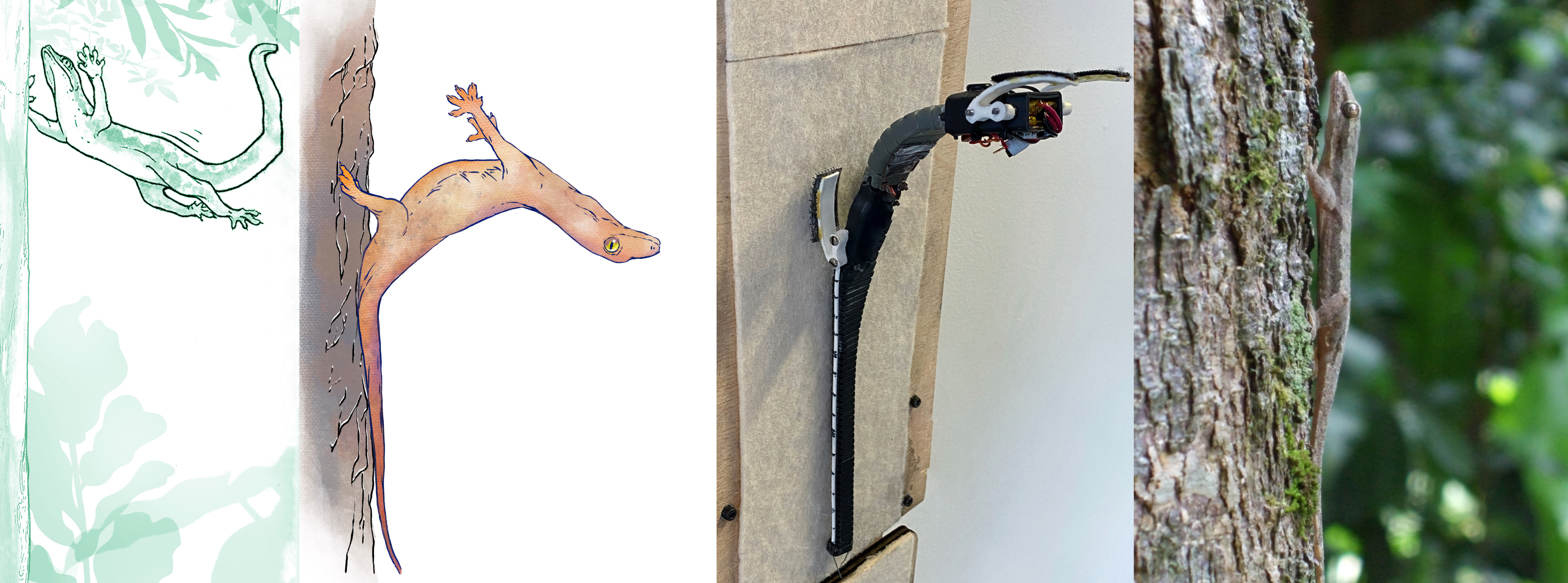 But how can one conclusively show that the tail has this stabilizing effect? Going back to the drawing board in the lab we developed a perching soft robot to better comprehend the pressures acting on the animal. This robotic physical model of the gecko's landing behavior serves for experimental validation of the dynamics on impact. To emulate the lizard's compliant body, we built a soft robotic platform with a soft torso, allowing the tail to be detached and reattached. When the front foot of the robot comes into contact with a surface, it bends its tail, similar to the climbing gecko reflexes previously found in the rainforest. A microswitch on the robot's underbelly provided tail actuation input, and gave feedback when the bottom of the head made contact with the wall. The information is processed by a microcontroller on the "shoulder" to immediately activate a motor in the "pelvis" that pulls on a "tendon" to push the tail against the wall to stabilize the robot.