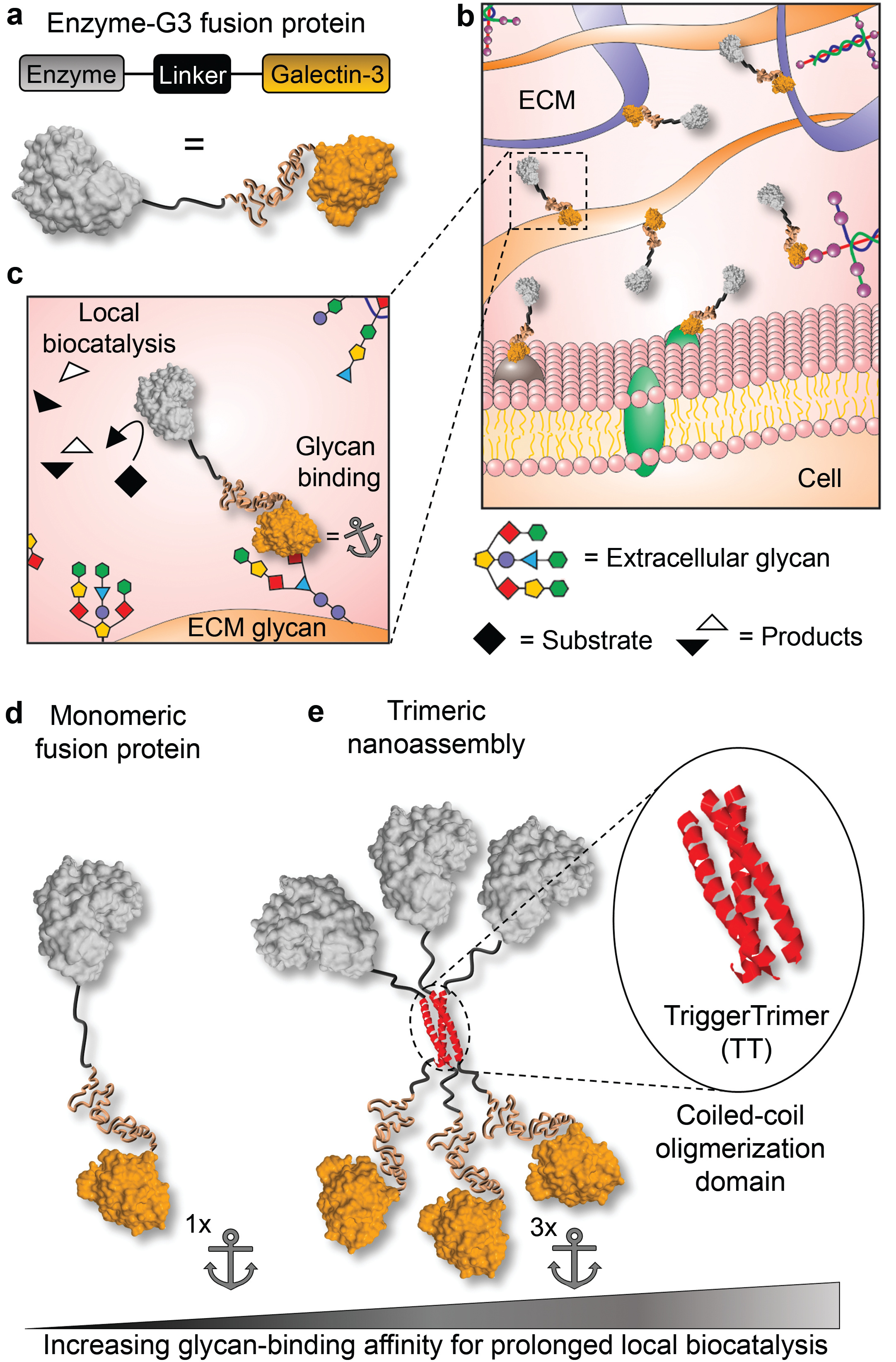 Figure 1. Design of galectin-3 fusion proteins to locally anchor enzymes to tissues via extracellular glycan binding. a-cSchematic of recombinant enzymes fused with galectin-3 (i.e., enzyme-G3 fusion protein), which are anchored to an injection site via binding to cell surface and extracellular matrix (ECM) glycans. dMonomeric fusion protein consisting of an enzyme linked to the N-terminal domain of galectin-3 via a flexible peptide linker.eTrimeric nanoassembly formed by inserting the TT domain between the enzyme and G3 domains. The trimeric nanoassembly has higher glycan-binding affinity than the monomeric fusion protein due to multivalent avidity effects.